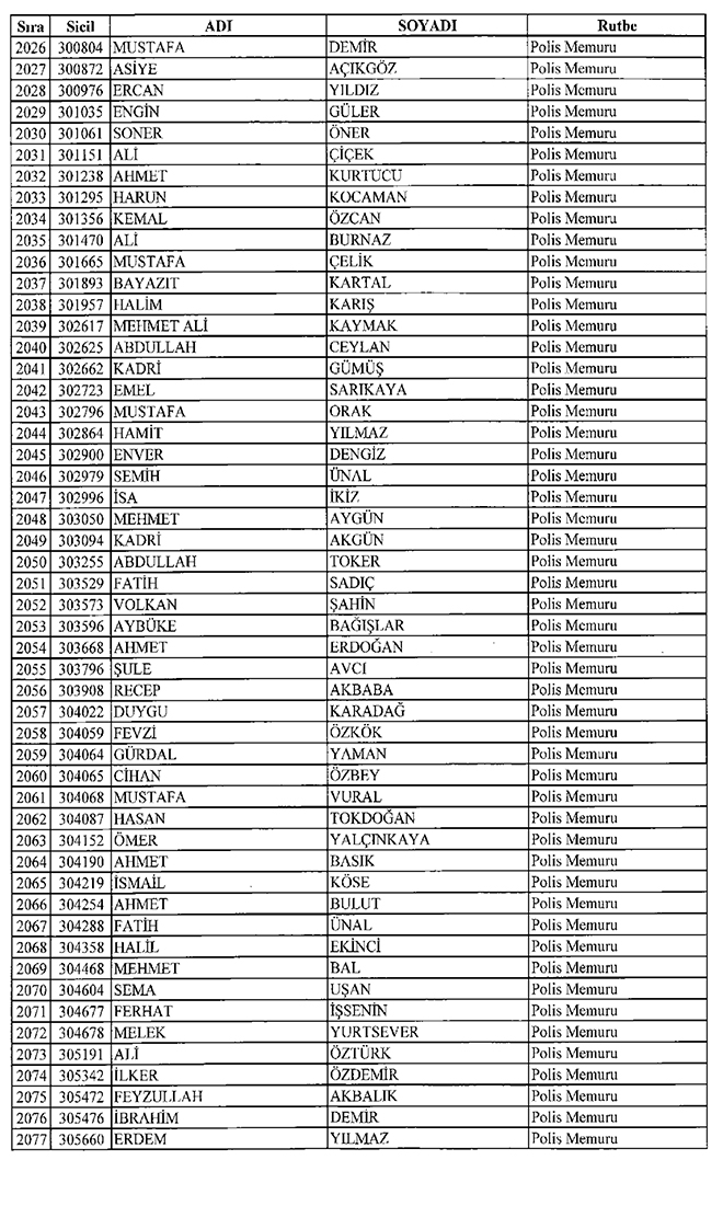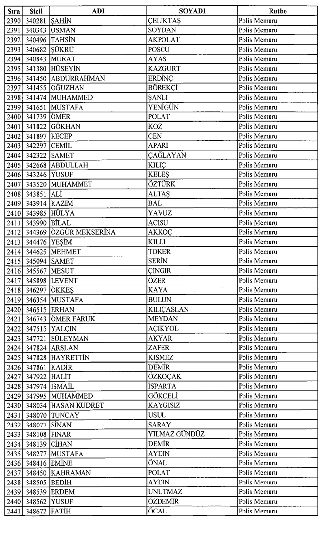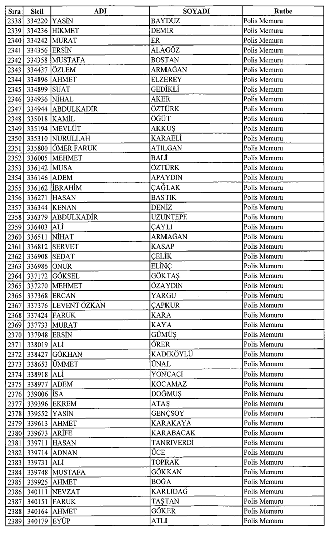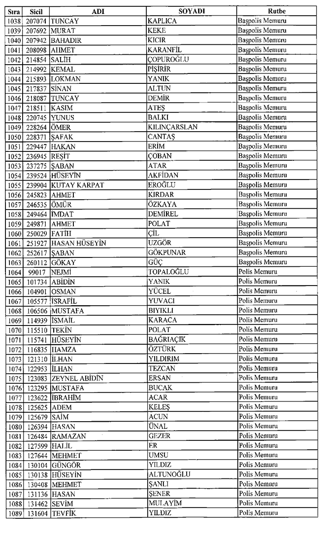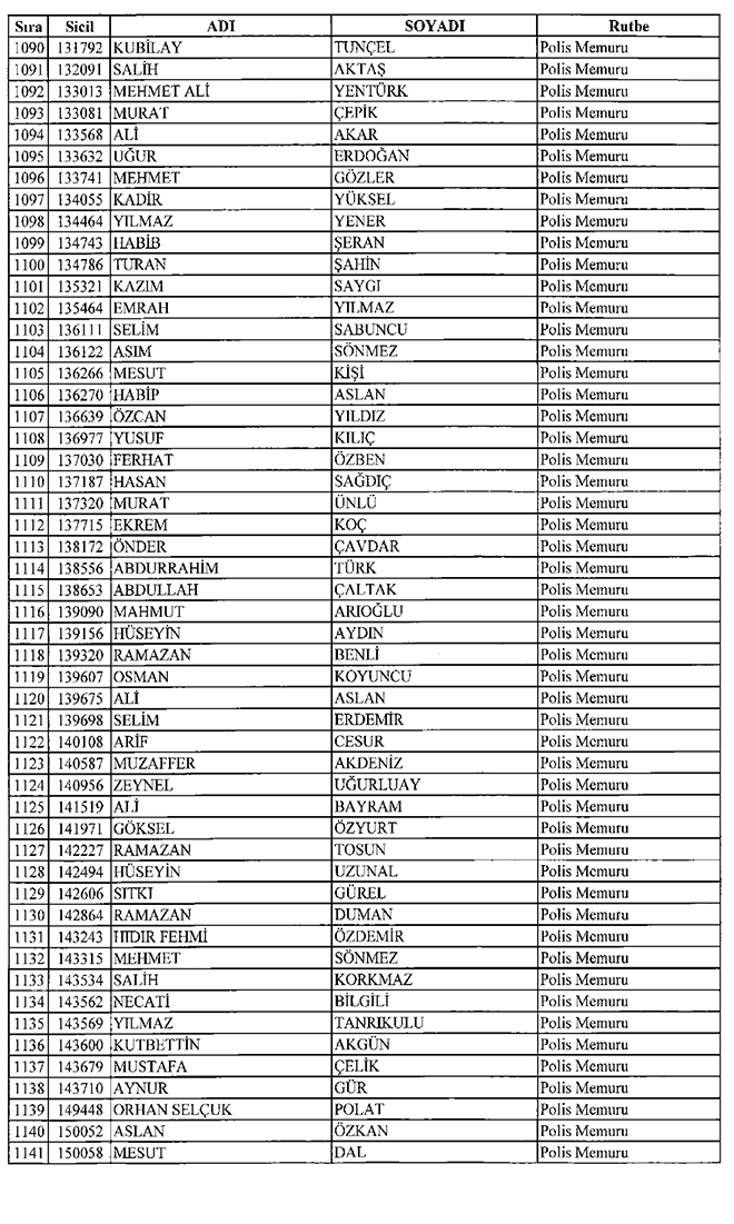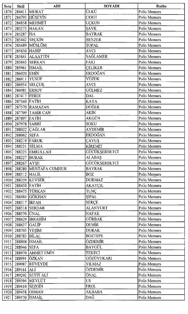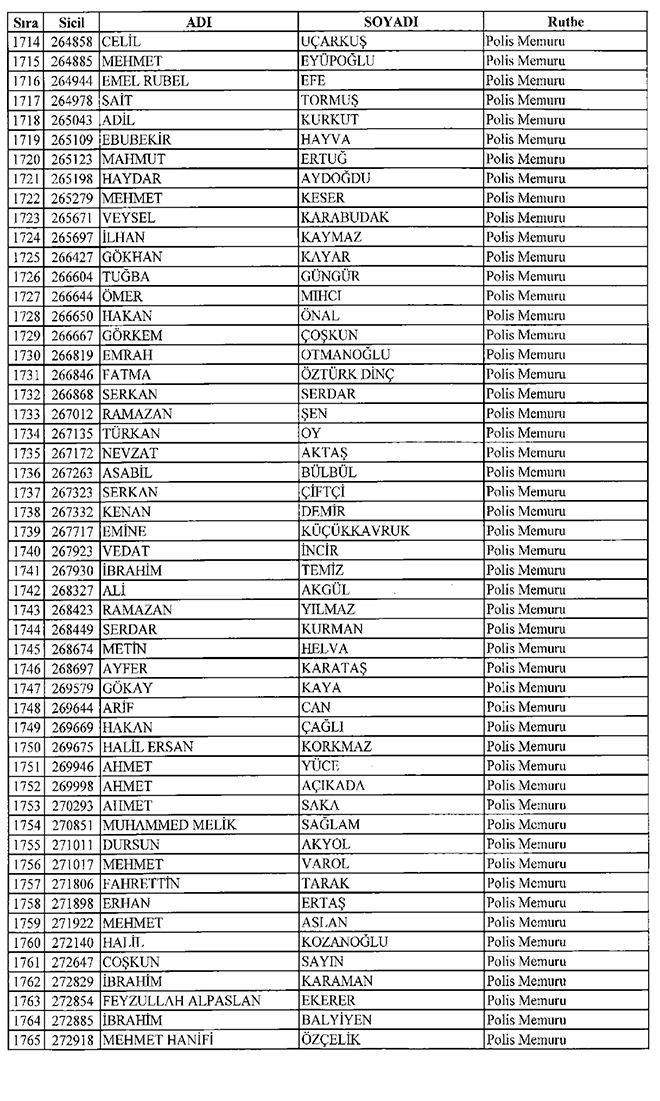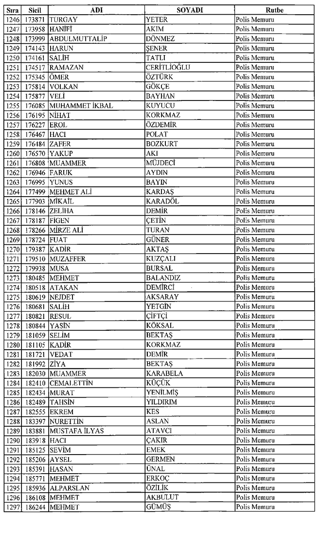 679 sayılı KHK ile Emniyet'ten ihraç edilenlerin listesi