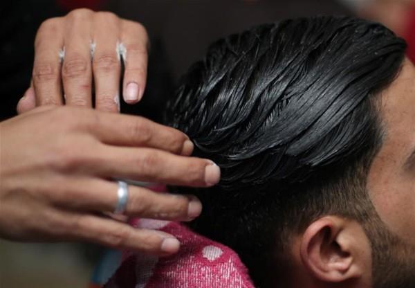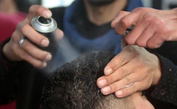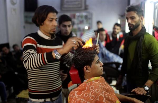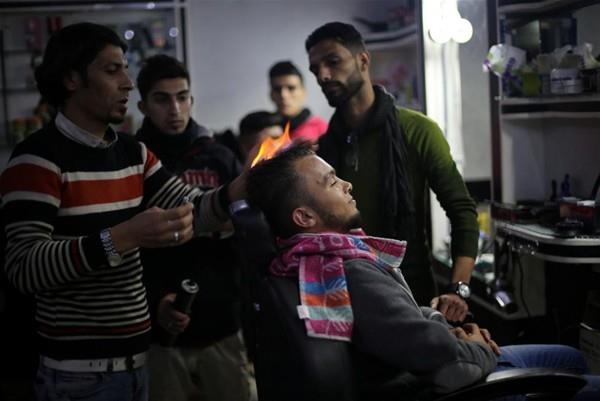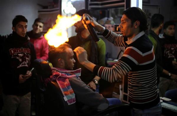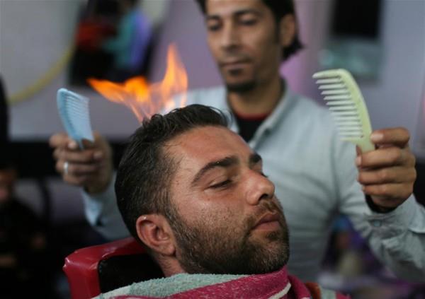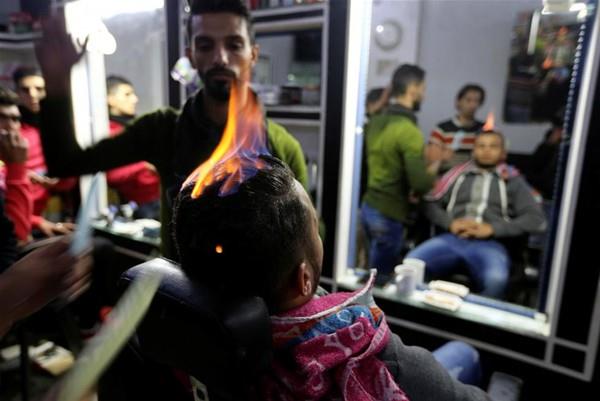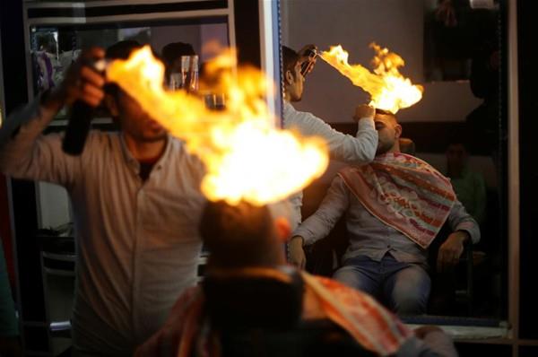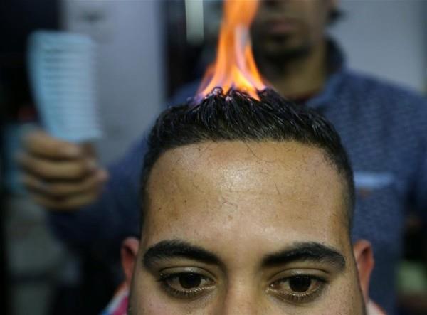 Gazze'de mülteci kampında çalışan Filistinli berber Ramadan Edvan, müşterilerinin saçlarına sıradışı şekilde fön çekiyor. Berber, fön çekmek için ateş kulllanıyor.