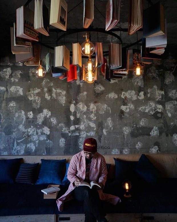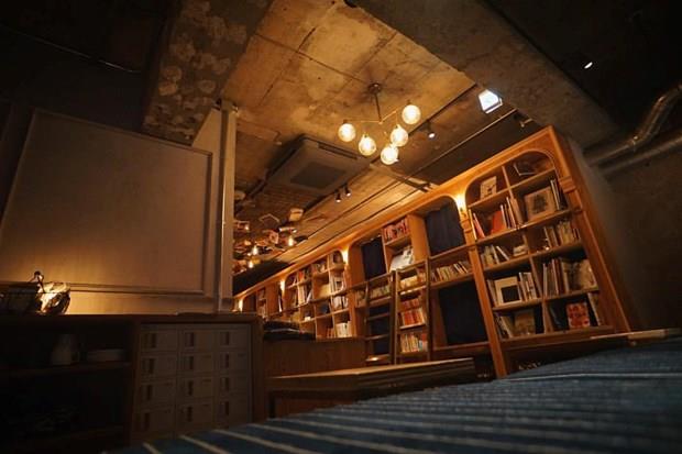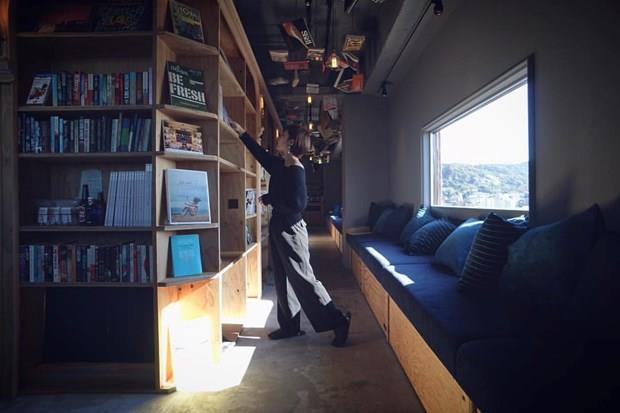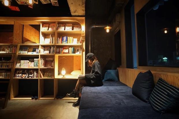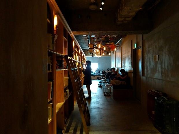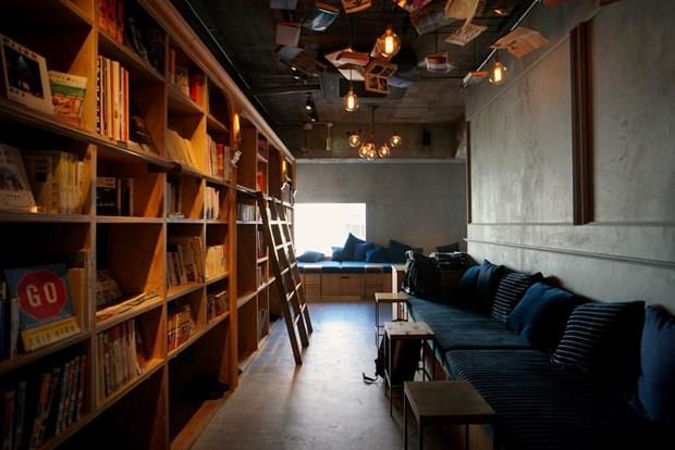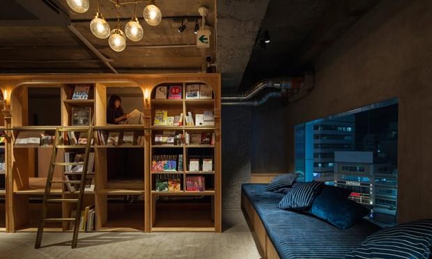 Eski bir pubun yerine yapılan otelin kütüphanesinde Japonca ve İngilizce kitaplar yer alıyor.