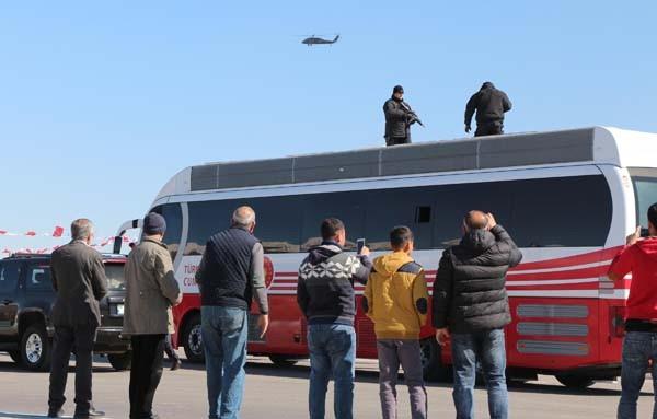 Cumhurbaşkanı Erdoğan, beraberindekilerle birlikte Ata uçağıyla öğleden sonra Kahramanmaraş'a geldi. Kahramanmaraş Havaalanı'nda, Vali Vahdettin Özkan, milletvekilleri, Büyükşehir Belediye Başkanı Fatih Mehmet Erkoç ve kent protokolü tarafından karşılandı. Yoğun güvenlik önlemlerinin alındığı, iki helikopterin de tur attığı havaalanından ayrılan Cumhurbaşkanı Erdoğan'ın otobüsünü yolda durdurup kendisini karşılayan kalabalığı selamladı, çocuklara satranç takımı hediye etti.