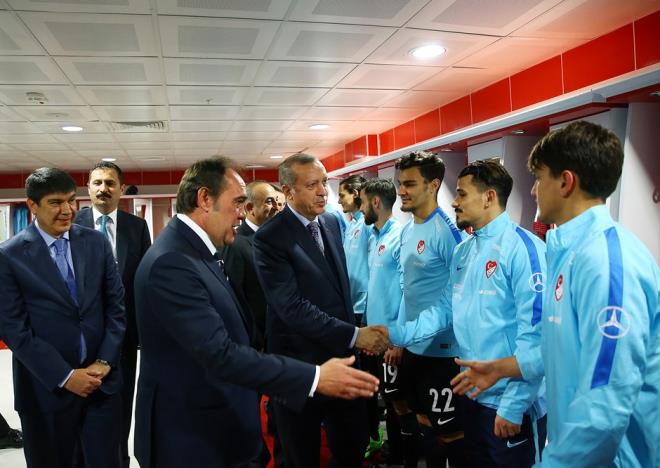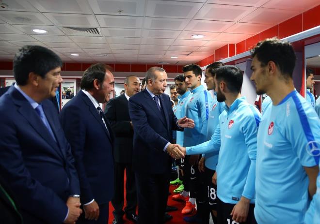 Erdoğan soyunma odasında son hazırlıklarını yapan millilerle tek tek tokalaşıp başarılar dilerken, "Allahtan ayaklarınıza güç" diliyorum ifadelerini kullandı.