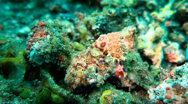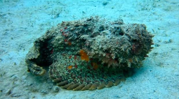 Tropik sularda kolayca saklanabilen taş balığı zehrini sırt yüzgecindeki dikenlerde taşır. -