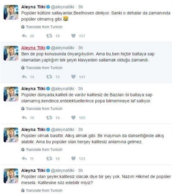 Şarkıcı Aleyna Tilki, Twitter'dan yaptığı paylaşmla kendini Nâzım Hikmet ile kıyasladı. Tilki'nin bu paylaşımlarına takipçileri tepki gösterdi.