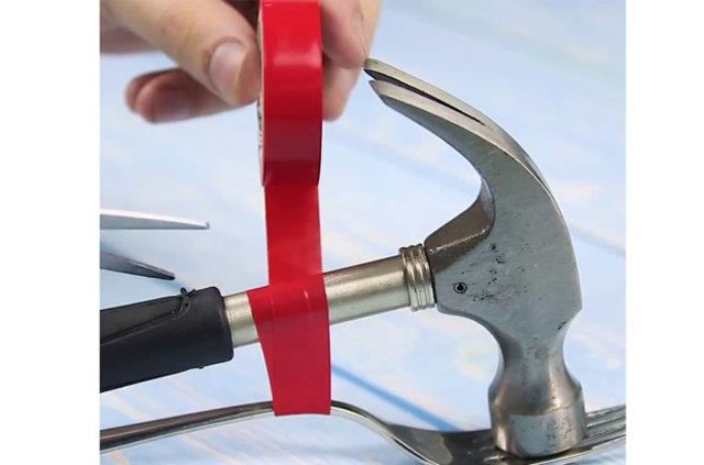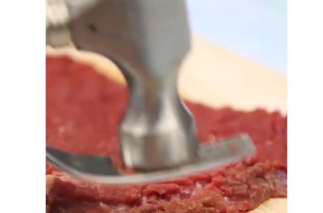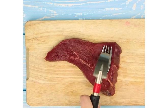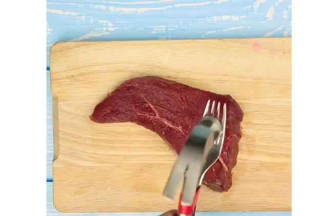 Bir çekiç ile çatalı bant ile şekildeki gibi bağlarsanız. Etlerinizi dövme işlemini yapabilirsiniz.