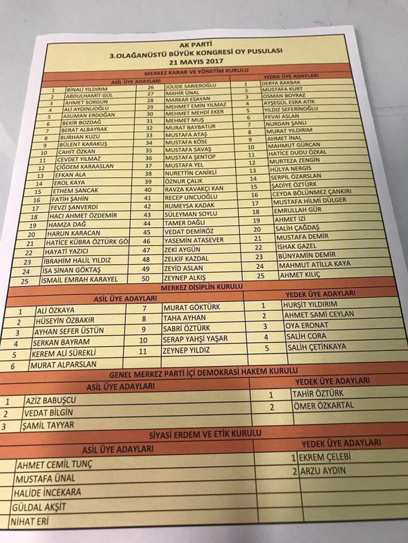 AK Parti'nin olağanüstü kongresinde Cumhurbaşkanı Recep Tayyip Erdoğan 1370 delegenin imzasıyla tek aday oldu. MKYK adaylığı için de tek liste var. Sabah saatlerinden itibaren 4 ayrı liste kulislerde dolaşmıştı. Asıl liste ise divan tarafından okundu. İşte AK Parti MKYK listesi:
