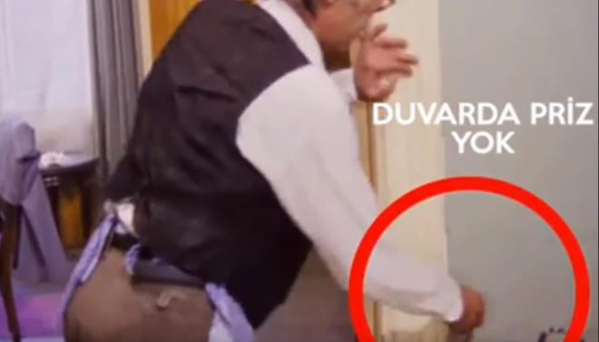 "Neşeli Günler" filminin bir sahnesinde Münir Özkul duvarda olmayan prize ütünün fişini takıyor.