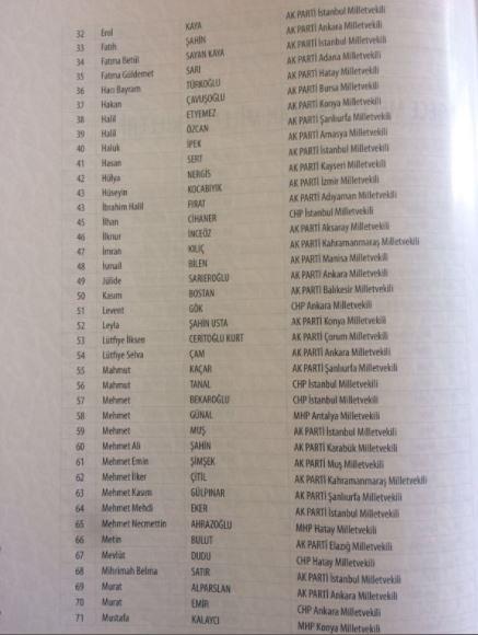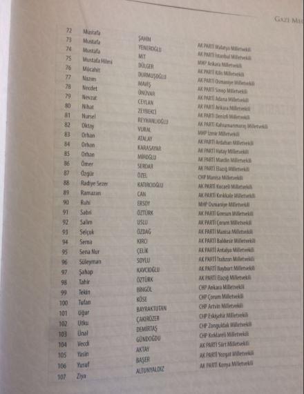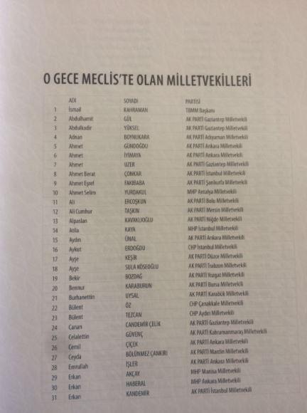 Gazeteci Yıldıray Oğur'un twitter adresinden, 15 Temmuz gecesi darbeye karşı Meclis'e gelen ve bombalandığı sırada Meclis'te olan vekillerin listesini yayınladı.