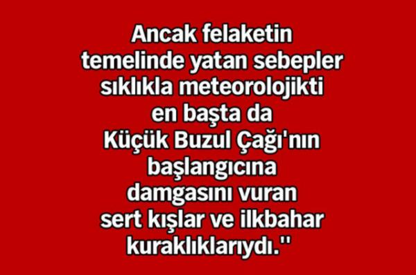 Kimileri Osmanlı'nın tarih sahnesinden silinişini 1789 Fransız İhtilali ile birlikte başlayan ulusalcılık akımına, kimileri uzak denizlere açılamamasına, kimileri de ordusunu modernize edememesi ve gelişmelere ayak uyduramamasına bağladı. Ancak, Alfa Yayınları'ndan çıkan ve ABD'deki küresel tarih ve çevre tarihi dersleri veren Sam White'ın kaleme aldığı 'Osmanlı'da İsyan İklimi' adlı kitap, imparatorluğun yıkılışına farklı bir bakış açısı getiriyor: ''Osmanlı İmparatorluğu'nun yıkılmasına Küçük Buzul Çağı mı neden oldu?''