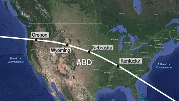 Güneş tutulmasının izlenebileceği ABD eyaletleri ise Oregon, İdaho, Montana, Wyoming, Nebraska, Kansas, Iowa, Missouri, İllinois, Tennessee, Kentucky, North Caroline, South Caroline ve Georgia olarak açıklandı.