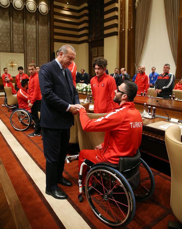 Cumhurbaşkanlığı’nda basına kapalı yapılan kabul, yaklaşık 2 saat sürdü. Erdoğan, kabulde milli sporcularla tek tek tokalaştı, ayaküstü sohbet etti.