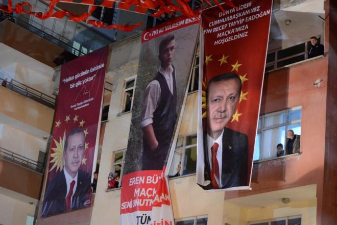 Erdoğan ve beraberindekileri taşıyan helikopter, Trabzon Havalimanı'nda yetkililer tarafından karşılandı. Erdoğan, daha sonra karayoluyla Eren Bülbül'ün ailesinin yaşadığı Maçka ilçesinin Merkez Mahallesi'ne bağlı Hacı Osmanoğlu Sokak'a geldi.