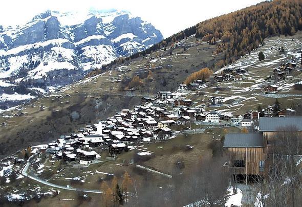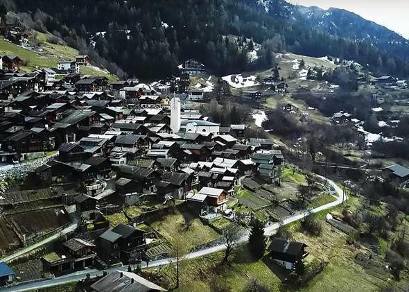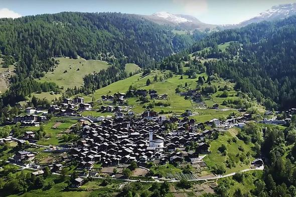 Dağ yamacına yayılmış olan evler, tipik Valais mimarisini yansıtıyor.