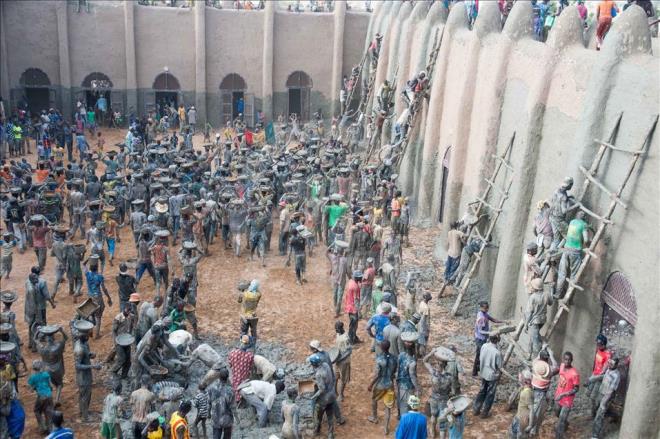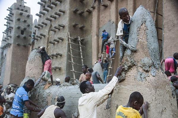 İçerisindeki yüzden fazla sütunun üzerinde ayakta duran camii, her yılın bir günü bölge halkının taşıdığı çamurlarla onarılıyor.