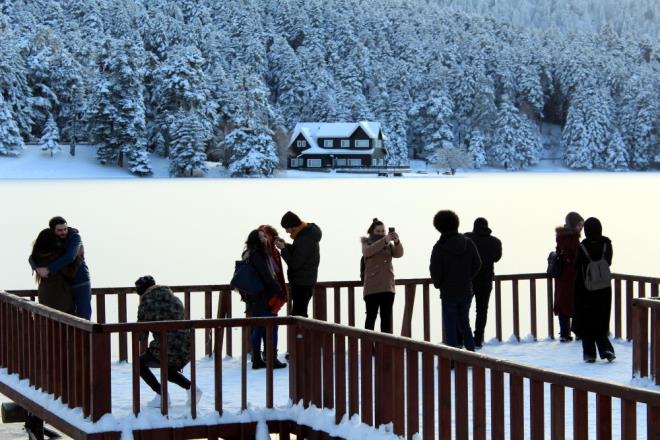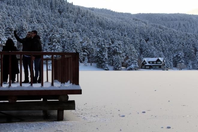 BOLU'nun doğa harikası Gölcük Tabiat Parkı'nda göl buz tuttu. Karla kaplanan ormanlarla gölün bütünleşmesi muhteşem bir görüntü oluşturdu. Kent merkezine 13 kilometre uzaklıkta bulunan çam ormanları arasında saklı Gölcük, buz kesti. Tabiat parkında gece eksi 5 derece olarak ölçülen hava nedeniyle göl yüzeyinin tamamı buzla kaplandı. 20 santim kar bulunan tabiat parkında gölün de donmasıyla kartpostallık görüntüler ortaya çıktı. Karla kaplı çam ormanları ve donan göl ziyaretçilerden yoğun ilgi gördü. Ziyaretçiler, göl çevresinde bol bol fotoğraf çekilip kartopu oynadı.