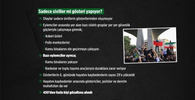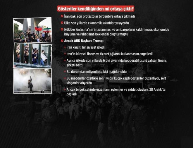 İran'da ABD destekli sokak olayları 28 Aralık 2017'de başladı. Gösteriler iki şehirde başladı fakat daha sonra ülke geneline yayıldı. Eylemciler ülkedeki ekonomik kriz nedeniyle protestoya başladı. Olayların başlamasından itibaren ise ABD ve İsrail'den göstericilere destek açıklamaları geldi. Peki göstericiler ne istiyor? İran'ın politikası ne? ABD ve İsrail aslında neyi amaçlıyor? İşte 10 maddede İran'daki gösteriler...