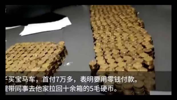 BMW marka aracı almaya karar veren müşteri ödemesi gereken 11 bin dolar değerinde ki peşinatı 400 bin yen bozuk para ile yapmak istediğini söyledi ve satış ofisi çalışanlarının bu ödemeyi onaylaması sonrasında koli koli bozuk parayla ödeme gerçekleşti.
