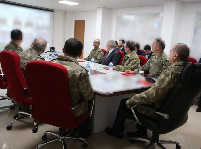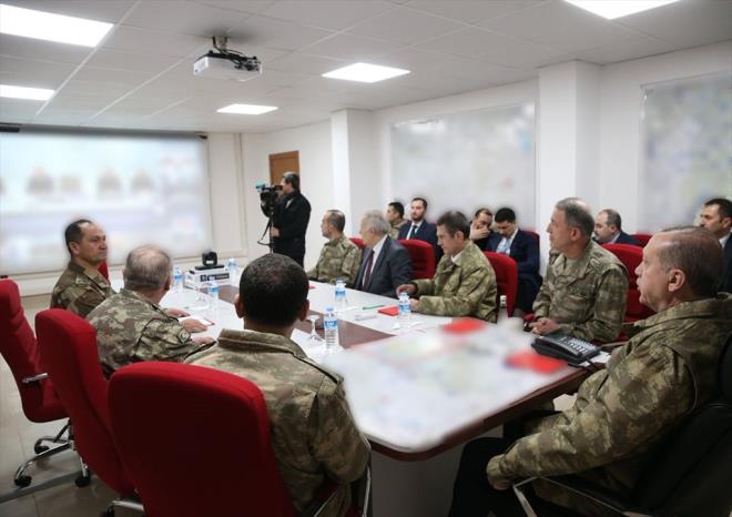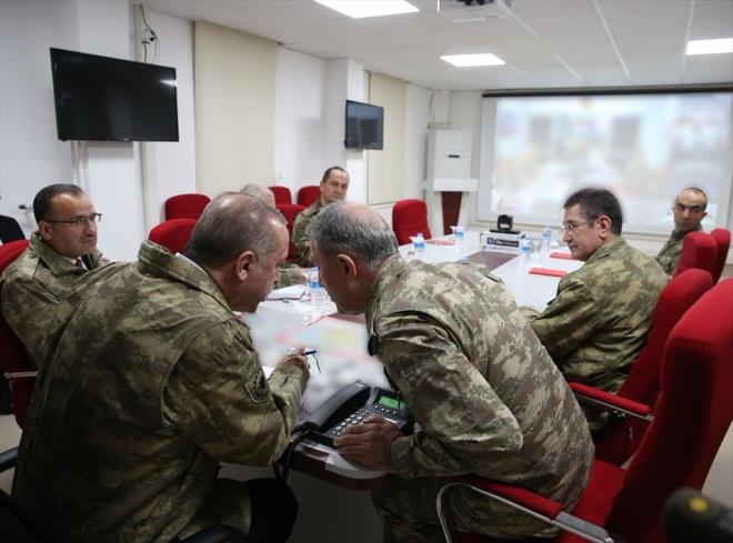 Cumhurbaşkanlığı kaynaklarından edinilen bilgiye göre, Cumhurbaşkanı Recep Tayyip Erdoğan, Genelkurmay Başkanı Hulusi Akar, Başbakan Yardımcısı Bekir Bozdağ ve Savunma Bakanı Nurettin Canikli ile Hatay'daki Harekat Merkezi'ne yaptığı ziyarette, Zeytin Dalı Harekatı hakkında bilgi aldı.