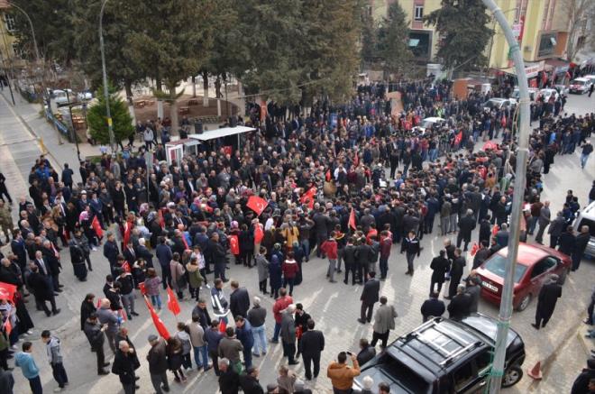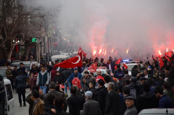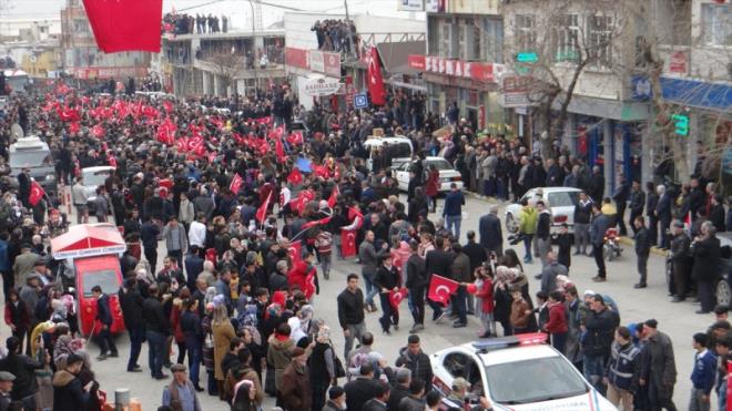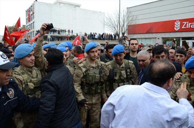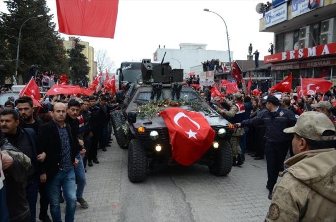 Güvenlik önlemleri altında geçiş yapan güzergah üzerinde toplanan vatandaşlar, "Şehitler ölmez vatan bölünmez, kahrolsun PKK, bizleri de Afrin'e götürün" sloganları attı.