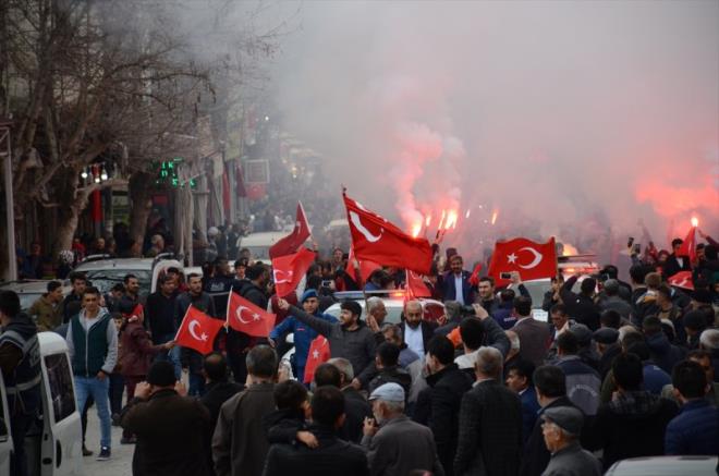Askerlerin otobüsle ilçe merkezinden geçişi sırasında vatandaşlar, askerleri uğurlamak üzere binlerce araçlık konvoy oluşturdu.
