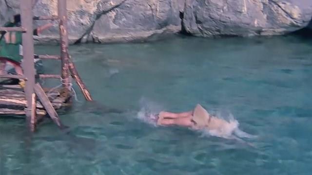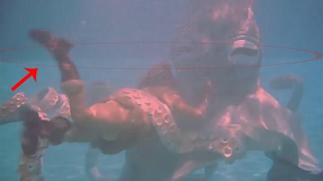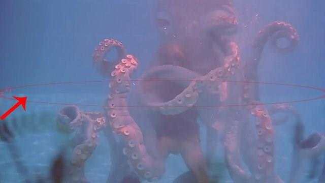 Ahtapot ile boğuşma sahnesinde arka planda çekimin yapıldığı havuzun duvarları görünüyor.