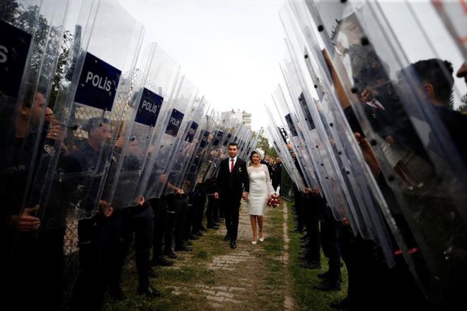 Antalya'da görev yapan polis memuru Ceren Ekinci, 10 ay önce silahından kaza ile çıkan kurşunun başına isabet etmesi sonucu yaralanmasına neden olan meslektaşı Taha Yasin Gül ile dünyaevine girdi. Polis çiftin gelin arabası ise TOMA oldu.