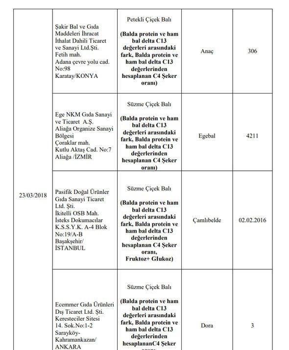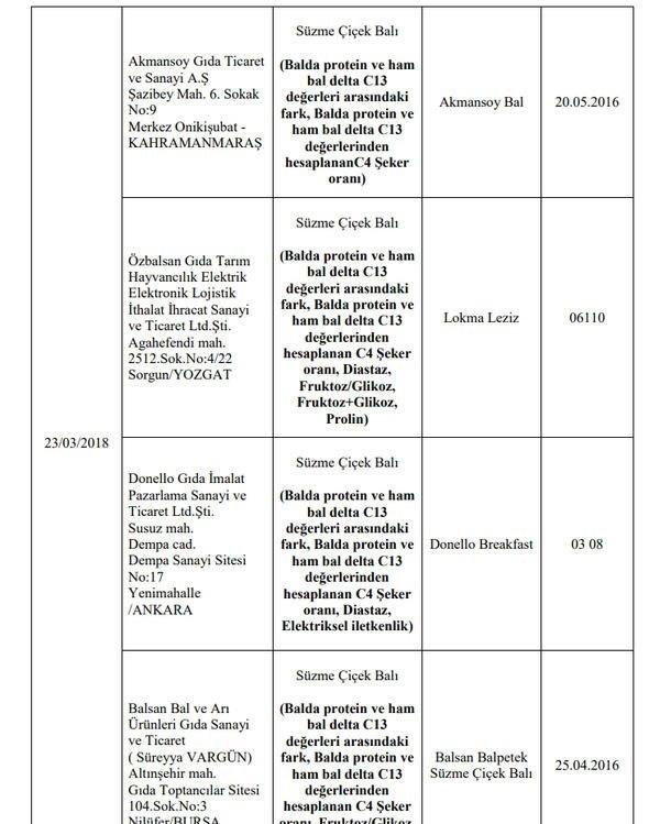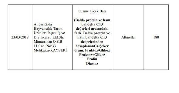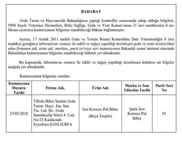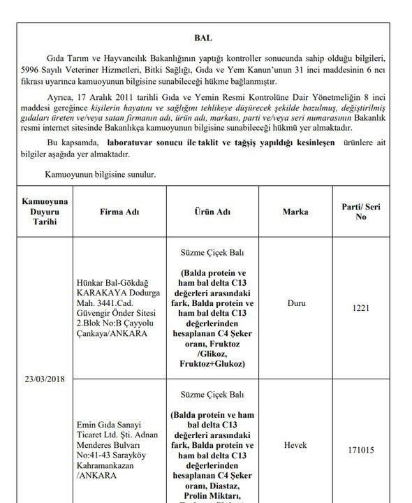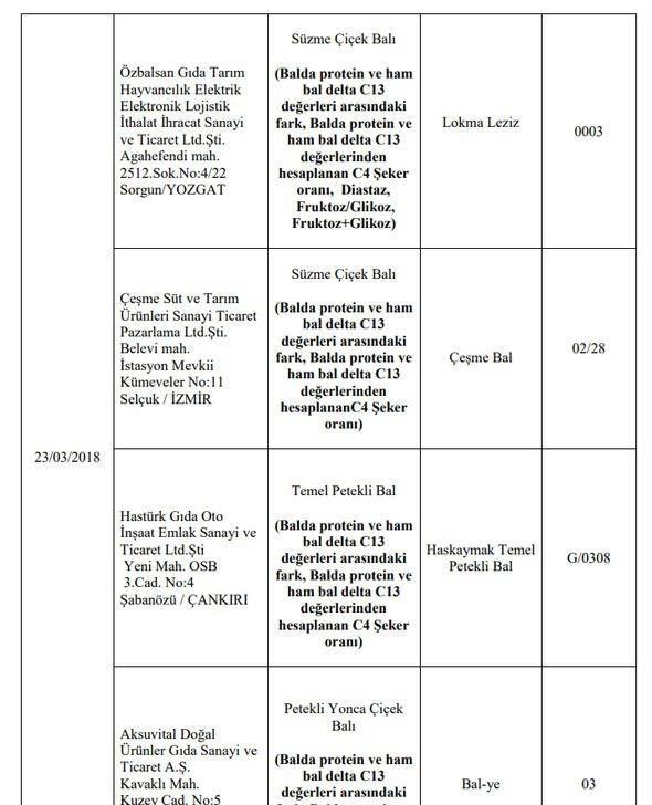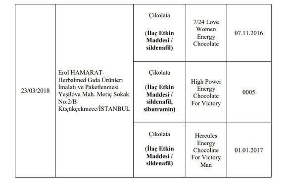 Alkolsüz içeceklerde 5, çikolatada 6, enerji içeceğinde 1, bitki çayında 1, baharatta da 1 parti ürününe ait bilgiler kamuoyuna ilan edildi. Taklit, tağşiş yapıldığı veya ilaç etken maddesi bulunduğu tespit edilen ürün, firma ve markaların bulunduğu listeye "www.tarim.gov.tr/GKGM" adresinden ulaşılıyor.