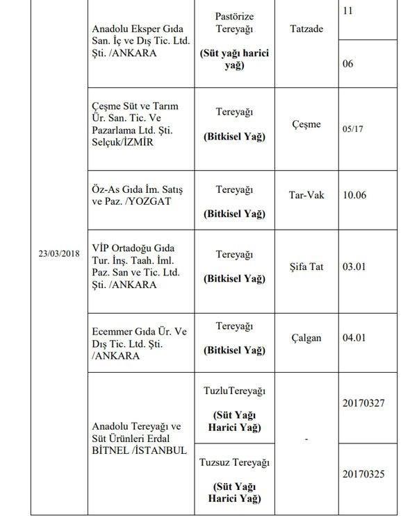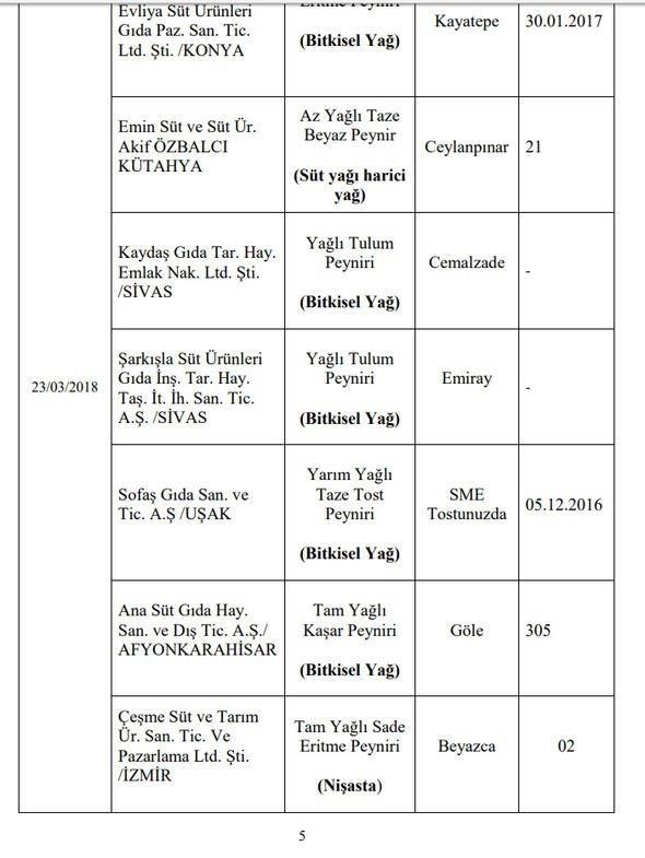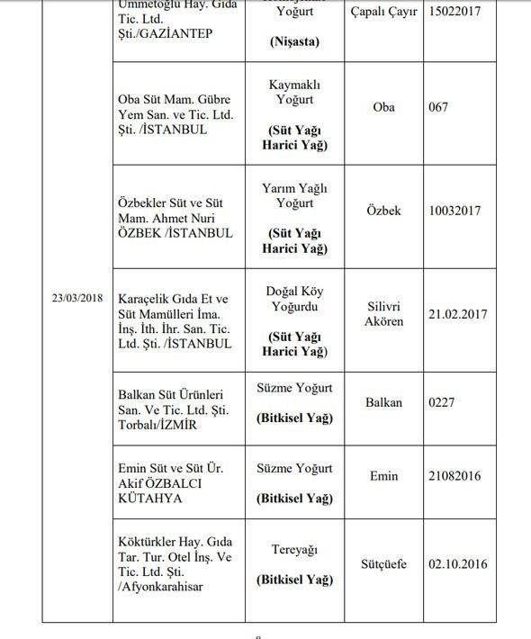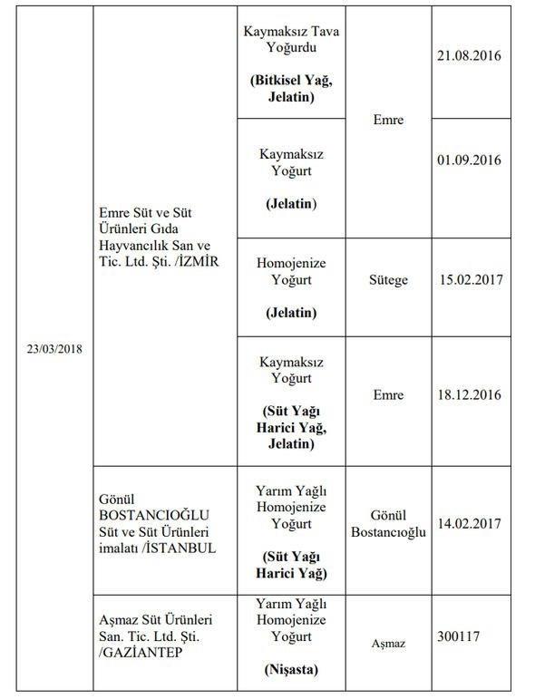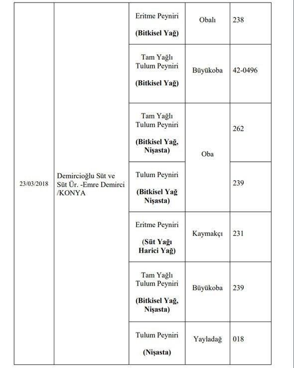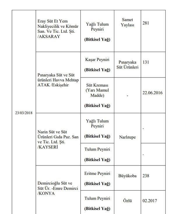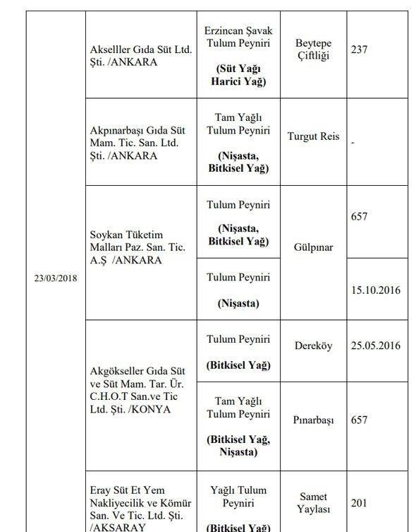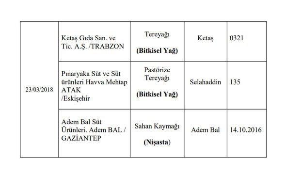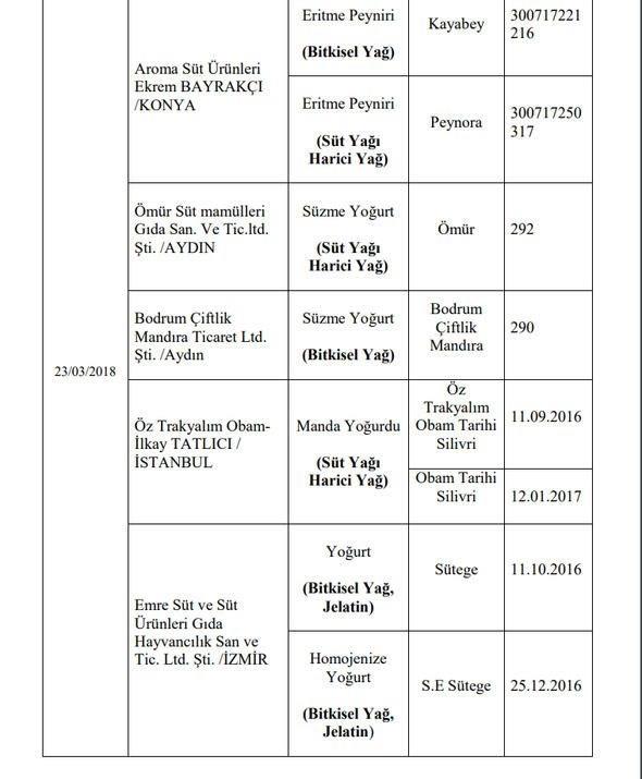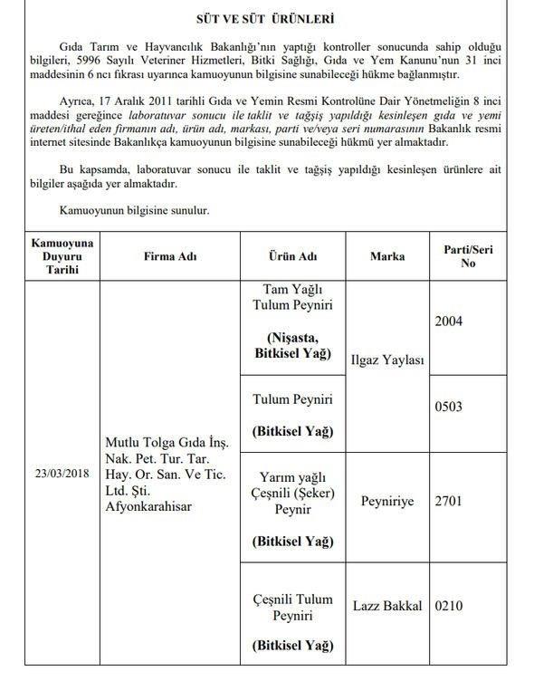 Gıda ve Kontrol Genel Müdürlüğünün internet sitesinde yer alan duyuruda, kontroller sonucunda süt ve süt ürünlerinde taklit ve tağşiş yapıldığı kesinleşen yoğurt, peynir, tereyağı, kaymak başta olmak üzere 64 parti ürüne ait bilgiler kamuoyu ile paylaşıldı. Süt ürünlerinde bitkisel yağ, jelatin, nişasta tespit edildiği belirtildi.