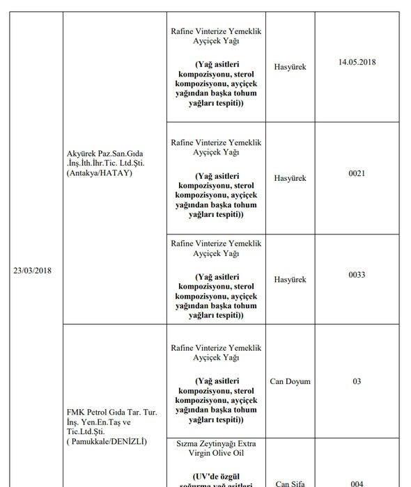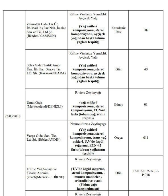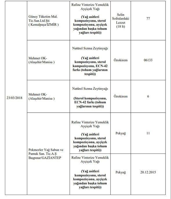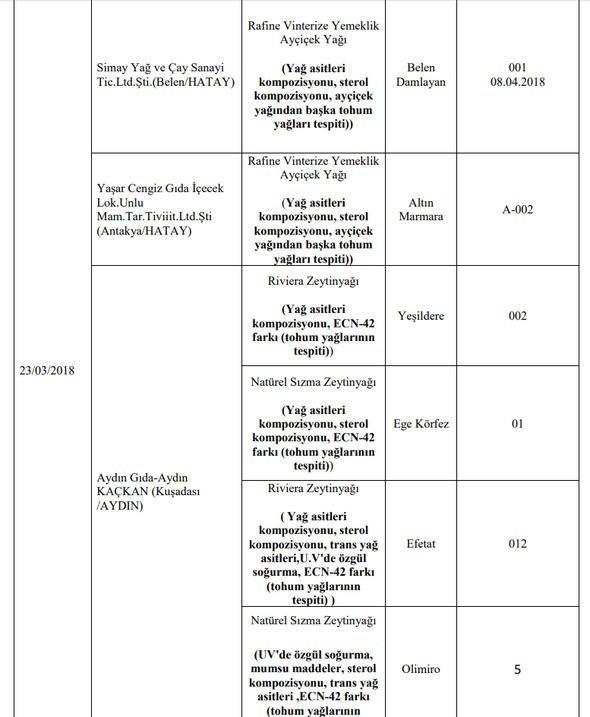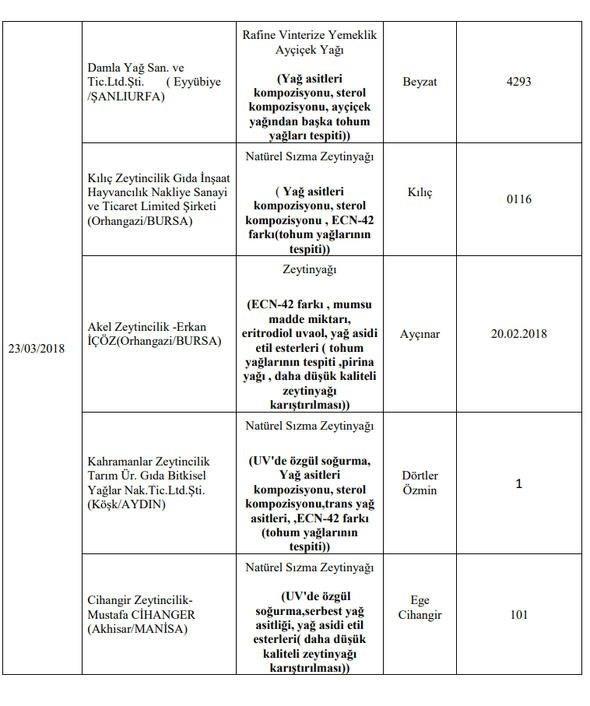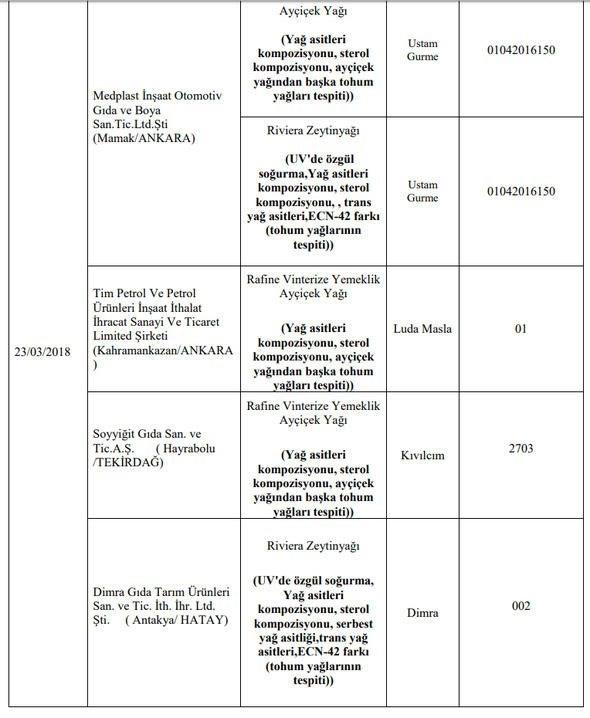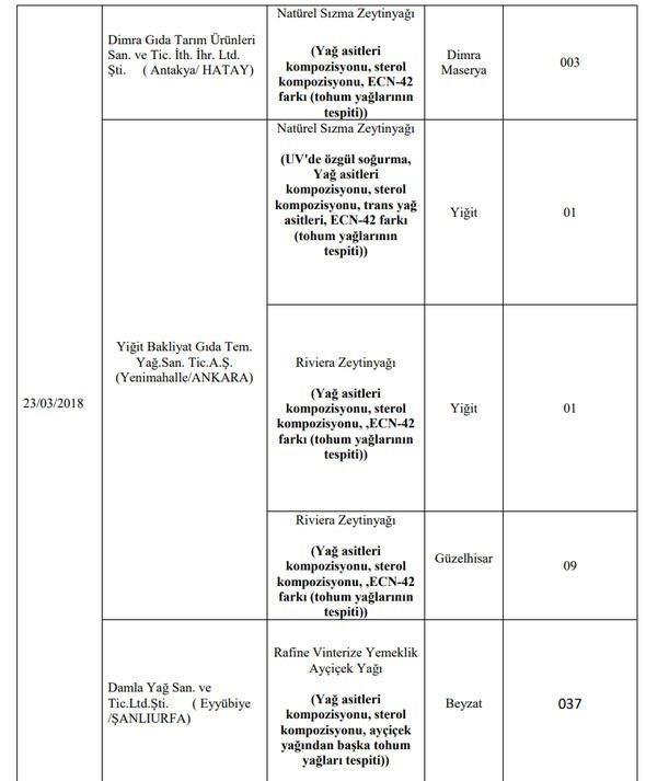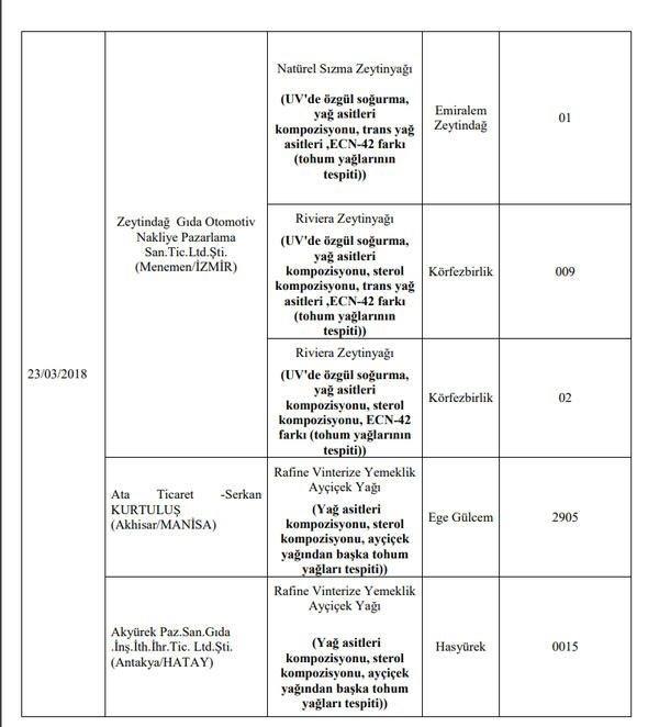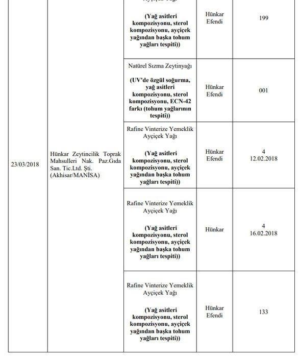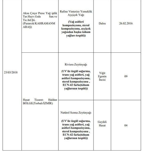 Bitkisel yağlarda da taklit ve tağşiş yapılan 104 parti ürüne ait bilgilere yer verildi. Bunların arasında zeytinyağı ve ayçiçek yağı bulunuyor.
