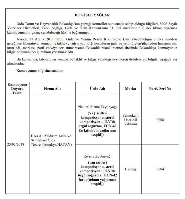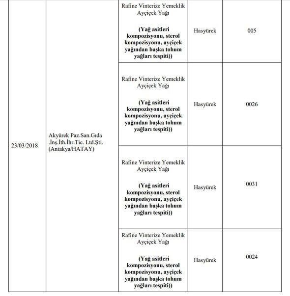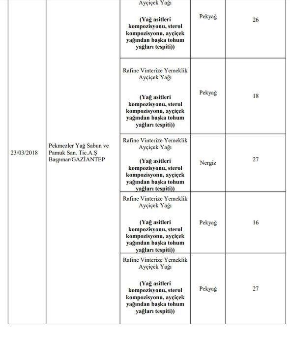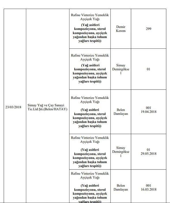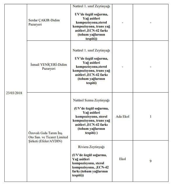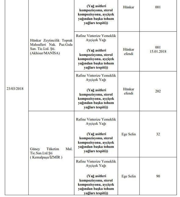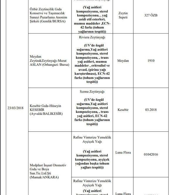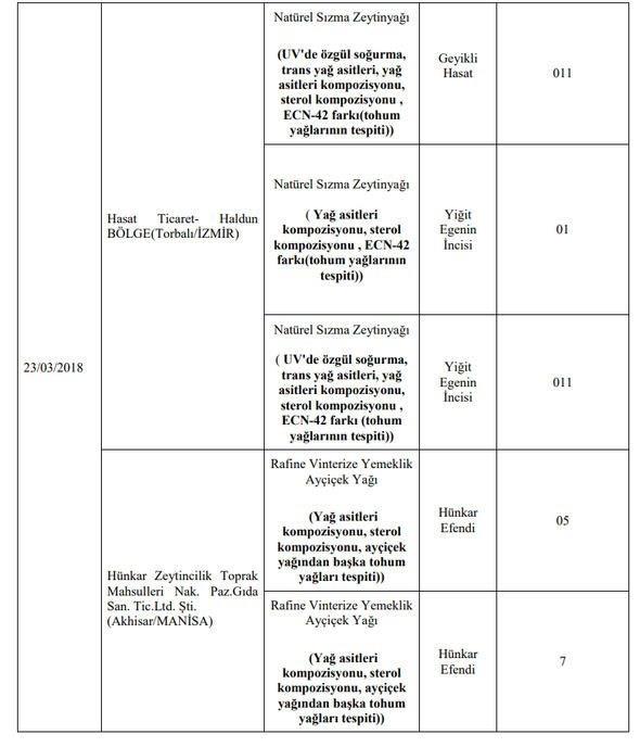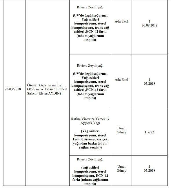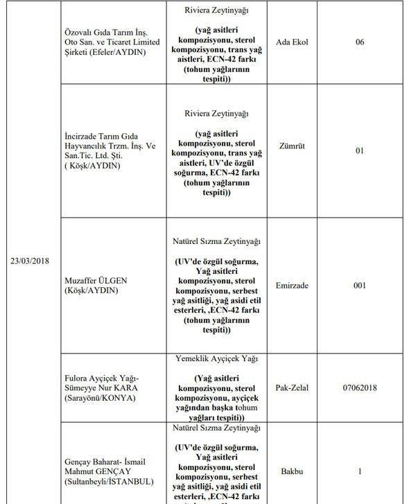Bitkisel yağlarda da taklit ve tağşiş yapılan 104 parti ürüne ait bilgilere yer verildi. Bunların arasında zeytinyağı ve ayçiçek yağı bulunuyor.