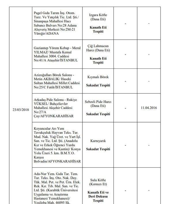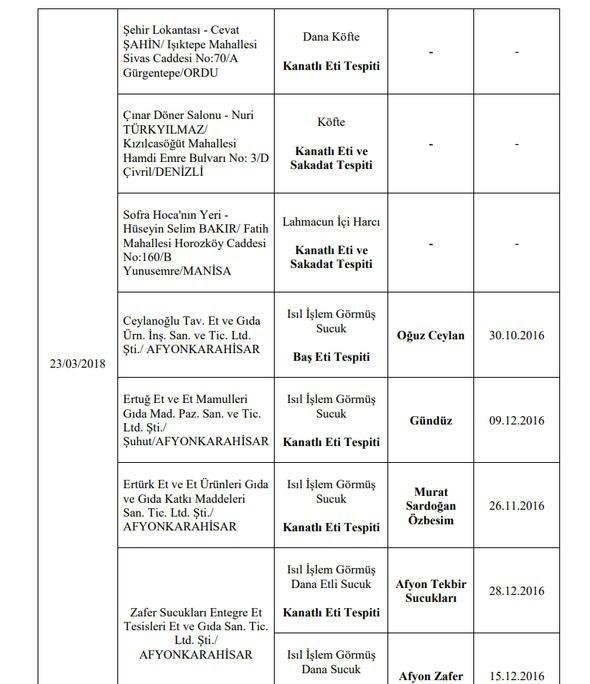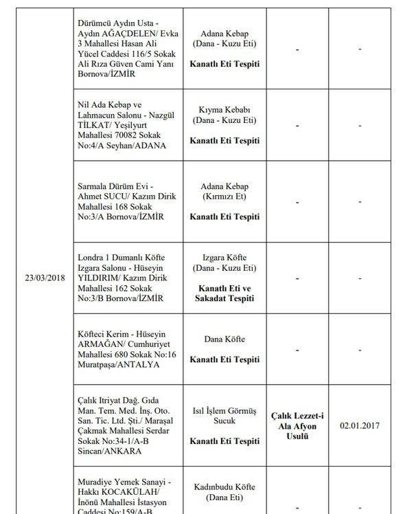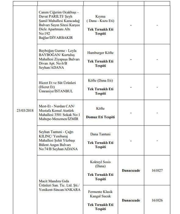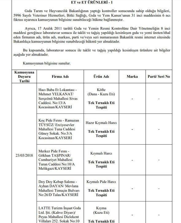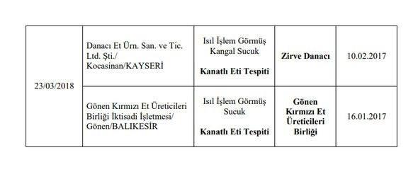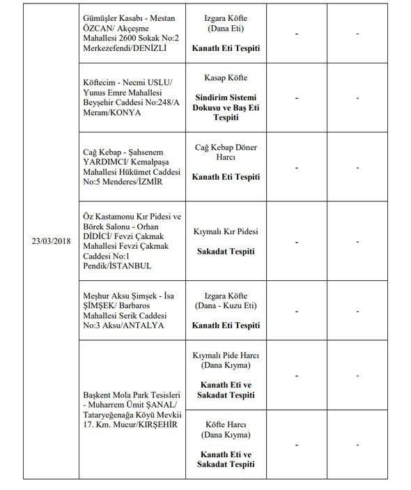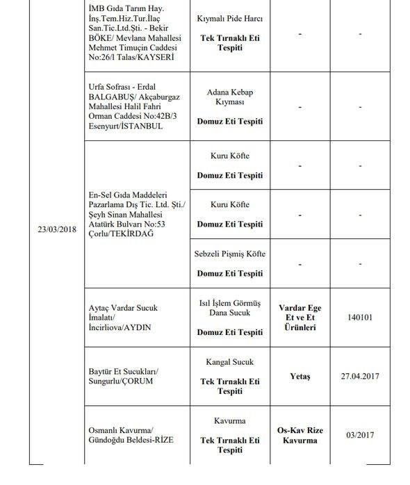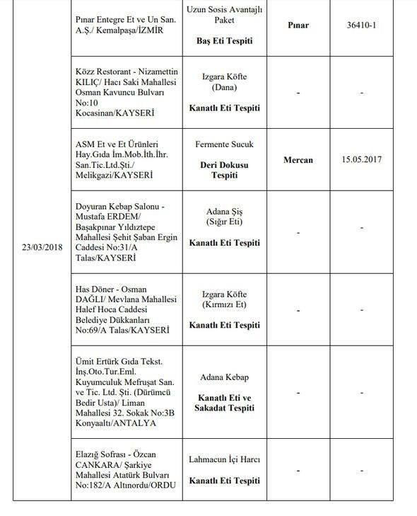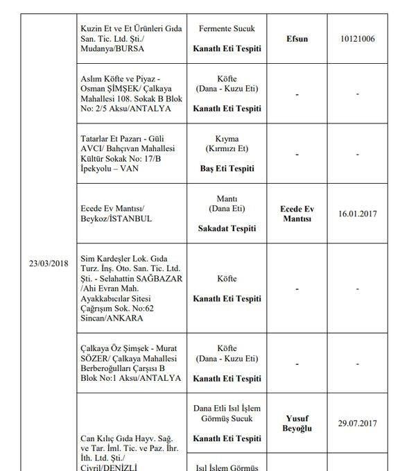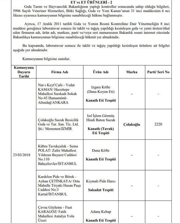 Et ve et ürünlerinde de laboratuvar tahlilleri sonucunda taklit ve tağşiş yapıldığı kesinleşen, sucuk, köfte, kebap, sulu köfte, karnıyarık, kıymalı börek, lahmacun, pide harcı ve döner ürünlerinin aralarında bulunduğu 70 parti ürüne ait bilgiler açıklanırken, içinde kırmızı et olduğu belirtilen ürünlerin çoğunda kanatlı eti tespit edildiği, özellikle pide ve yemek harçlarında sakatat, deri, baş eti gibi tağşişlere rastlandığı ifade edildi.
