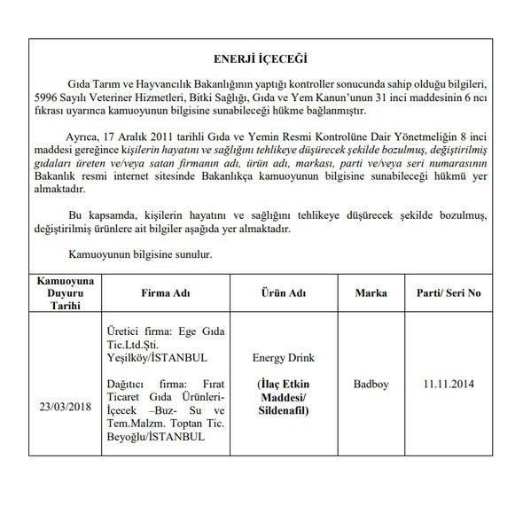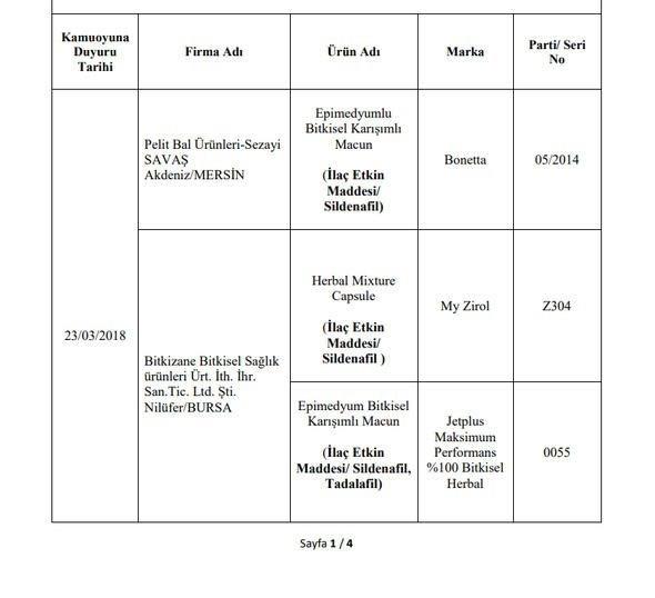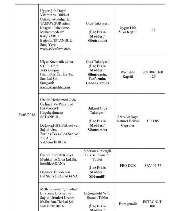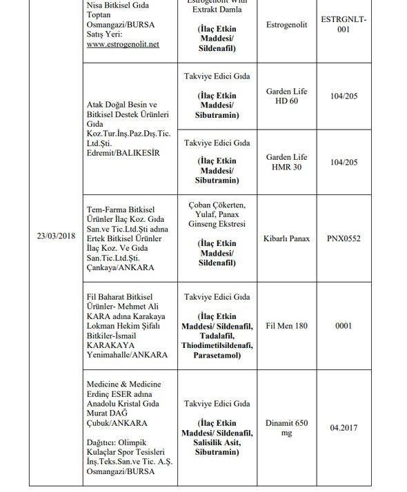 Duyuruda, takviye edici gıdalarda da değiştirilmiş 15 ürüne ait bilgiler yer aldı. Bitkisel macun ve bitkisel gıda takviyelerinde sıklıkla ilaç etkin maddesi "sildenafil"e rastlandığı bildirildi. Balda da taklit ve tağşişle üretilen 15 parti ürün açıklamada yer aldı.