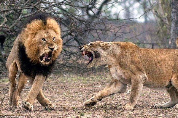 Bir erkek ve dişi aslan, Güney Afrika'daki Kruger ulusal parkında şiddetli bir kavgaya tutuşurken fotoğraflandı.