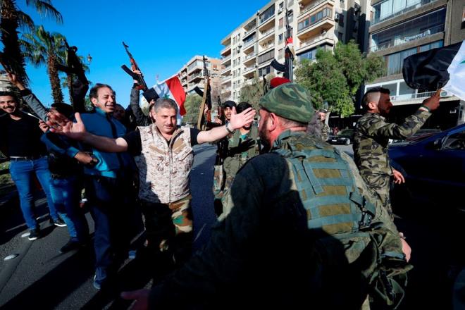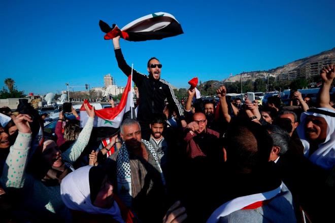 Suriye Devlet Başkanlığı sarayının önünde toplanan bir grup, Esad lehine sloganları attı.