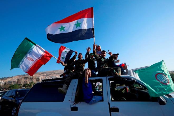 Gösterilerde Suriye, İran ve Rusya bayrakları dalgalandı.