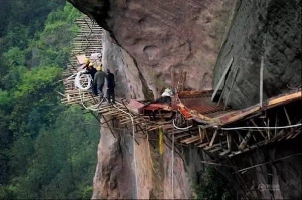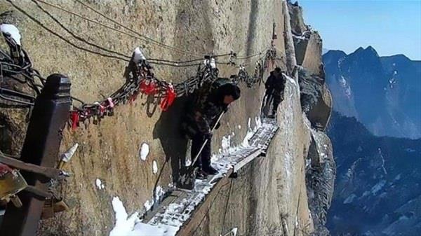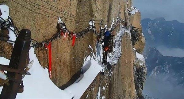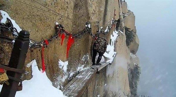 Çin'deki Hua shan Dağı pek çok turistin uğrak yürüyüş parkurlarından biri. Fakat bu dar tahtaları kardan temizlemek için çalışan işçiler,görenleri hayrete düşürüyor.