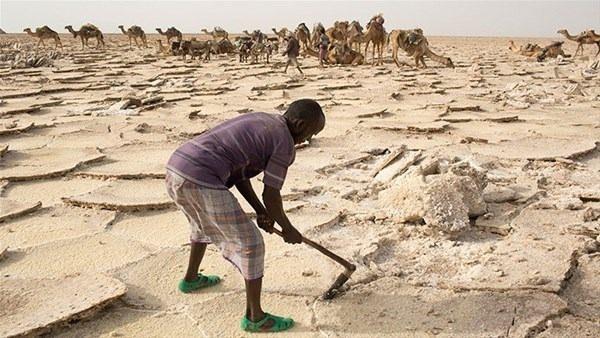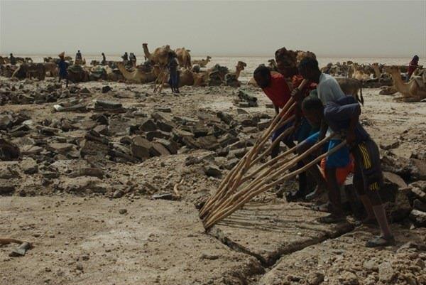 Etiyopya'da 35 derece sıcaklıkta tuz çıkaran işçiler.