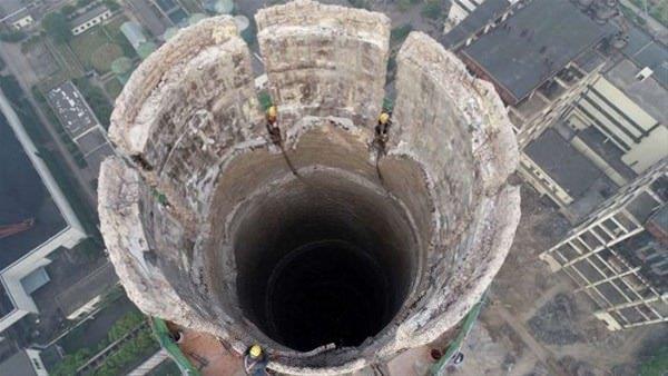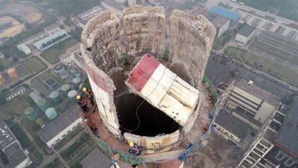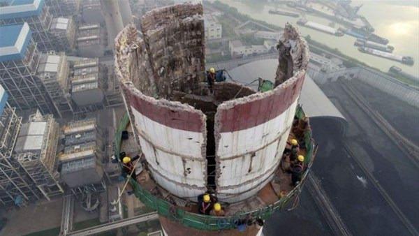 Çin'de bulunan bu binanın baca kısmını yıkmaya çalışan çalışanlar metrelerce yükseklikte çalışmak zorunda kalıyor.