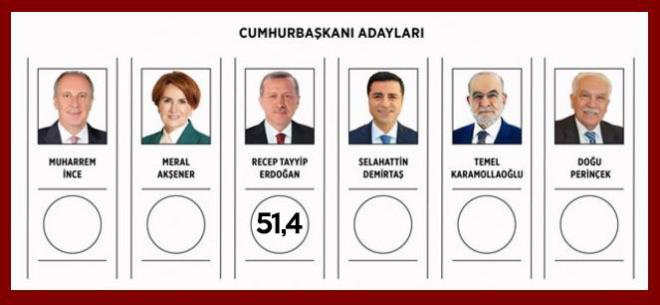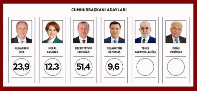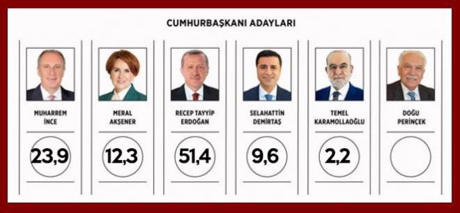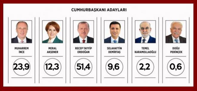 Kararsızlar dağıtıldıktan sonra ise cumhurbaşkanı adaylarının oy oranları şöyle çıkıyor: - Recep Tayyip Erdoğan: Yüzde 51,4 - Muharrem İnce: Yüzde 23,9 - Meral Akşener: Yüzde 12,3 - Selahattin Demirtaş: Yüzde 9,6 - Temel Karamollaoğlu: Yüzde 2,2 - Doğu Perinçek: Yüzde 0,6