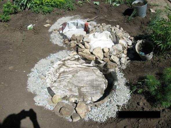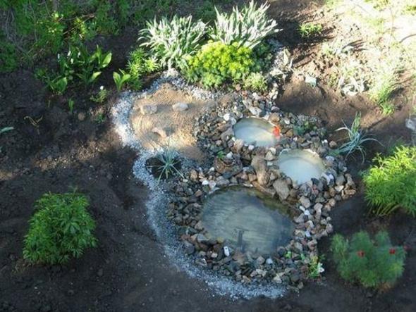 Daha sonra lastiklerin efrafını taşlarla çeviren kadın lastiğin içerisine su doldurarak süs havuzunu tamamladı.