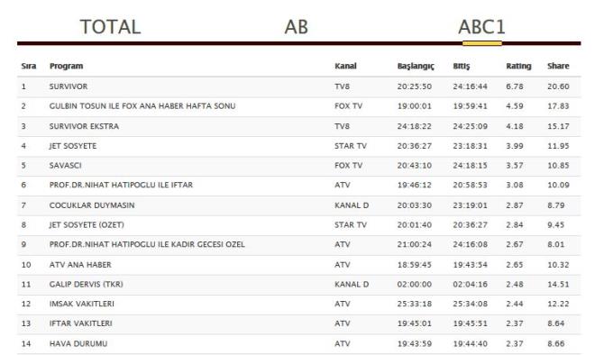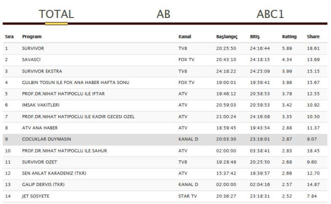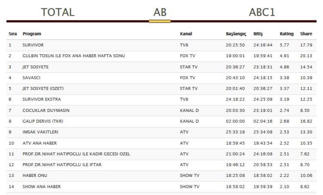 10 Haziran Cumartesi gününün ABC1'de reyting sonuçları şöyle;