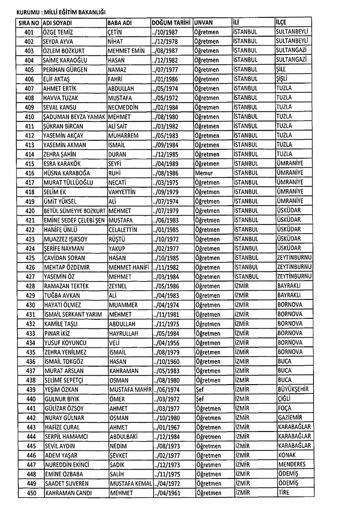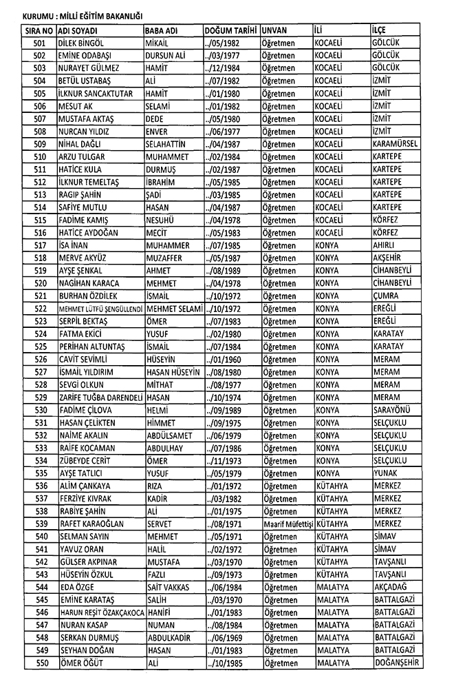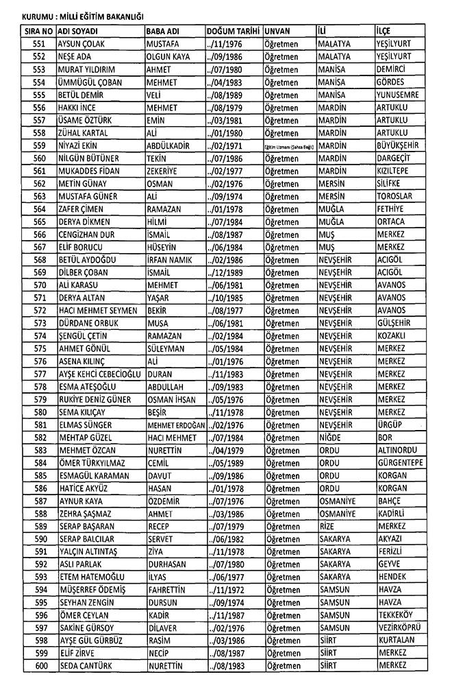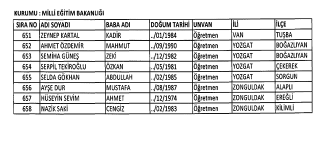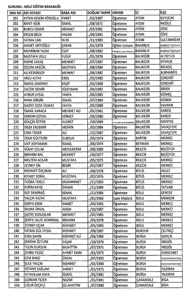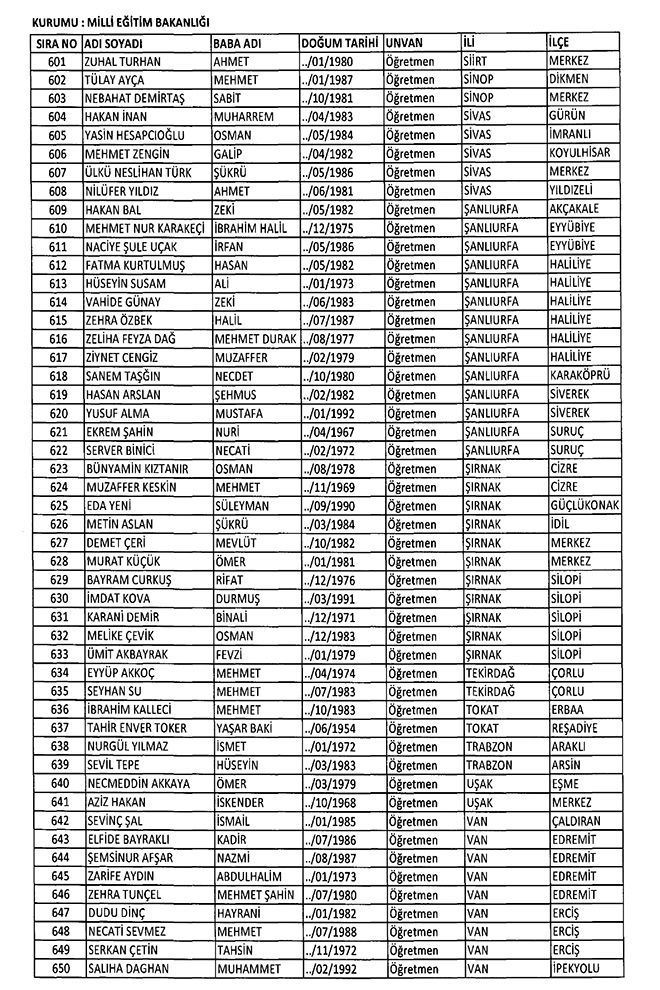 8 Temmuz 2018 tarihli Resmi Gazetede yayımlanan 701 sayılı KHK ile ihraç edilen 658 öğretmenin isim listesi