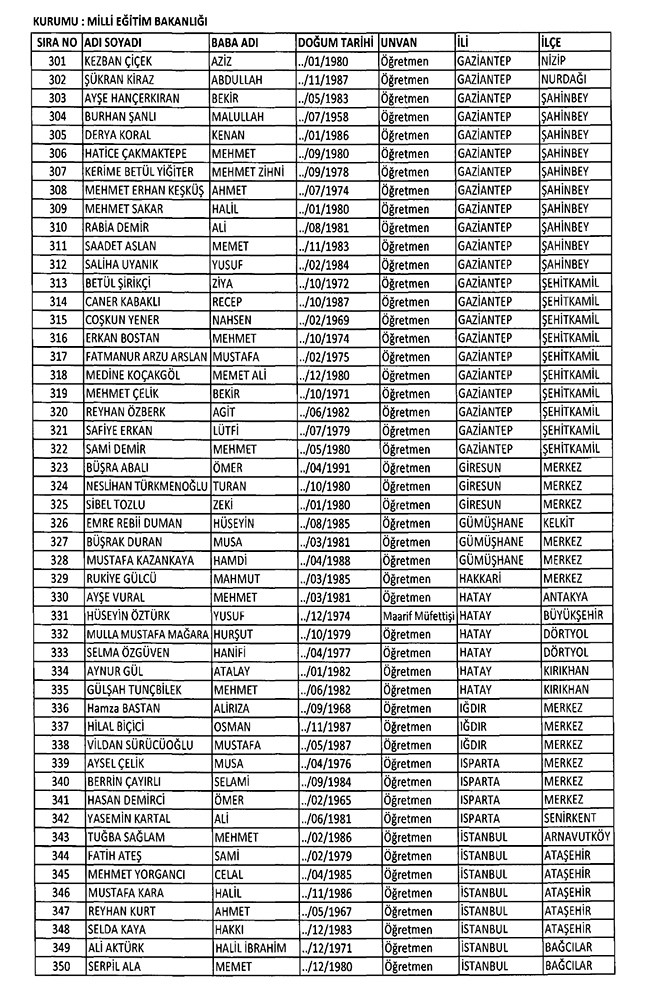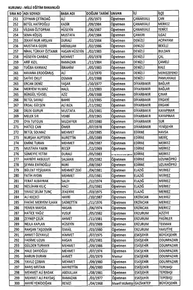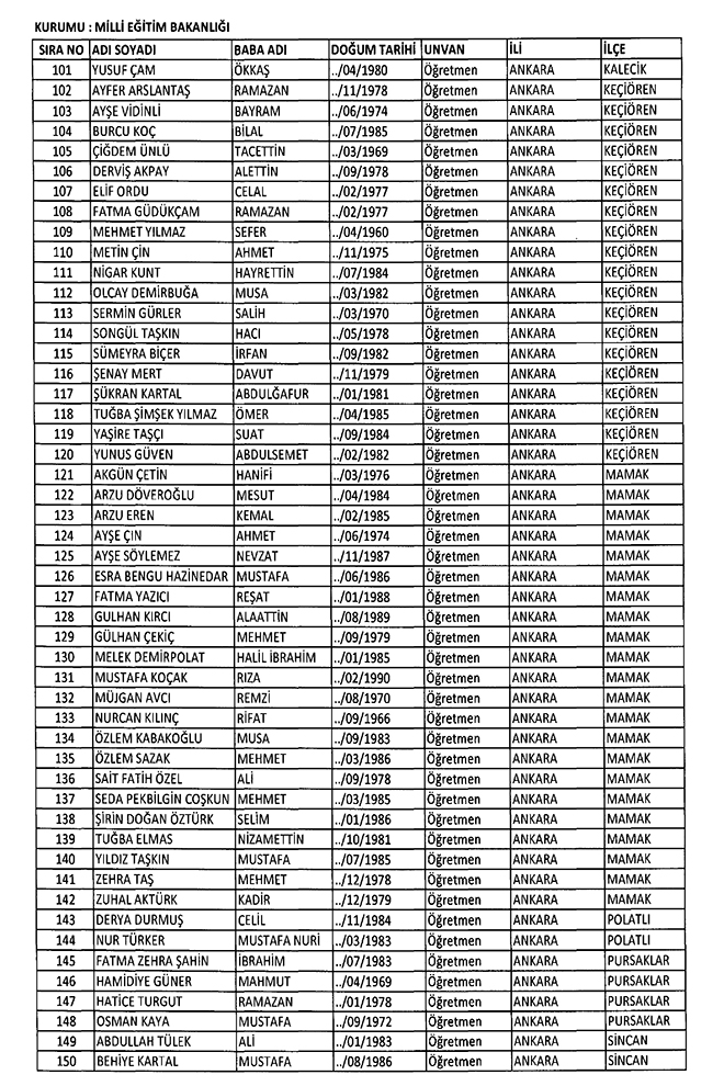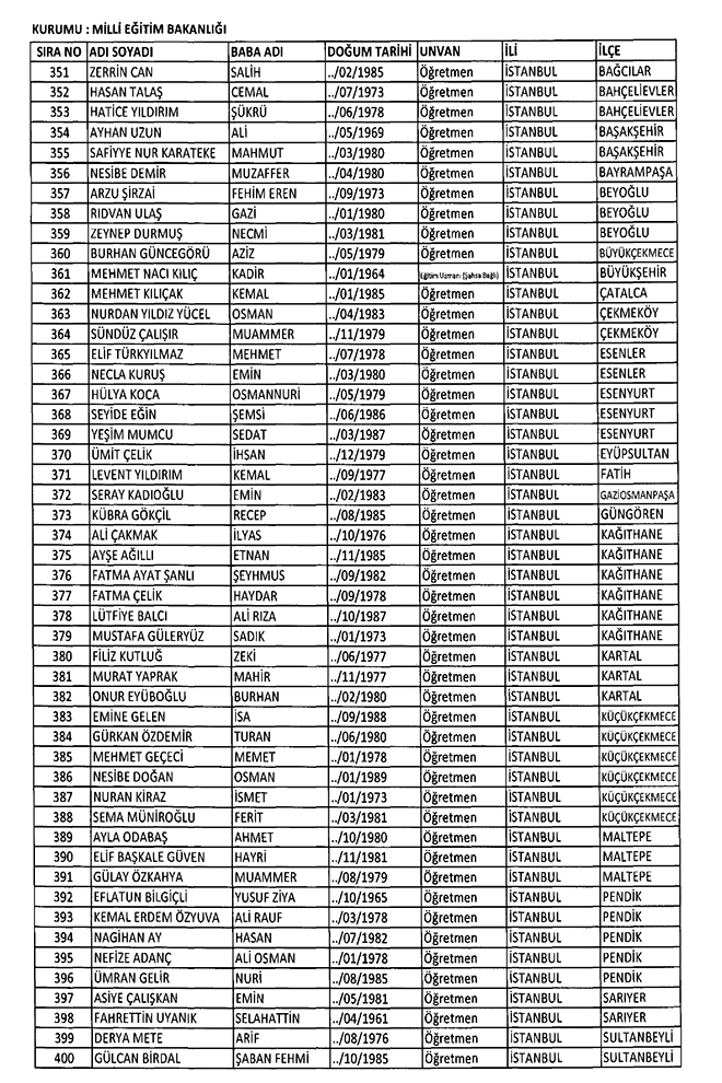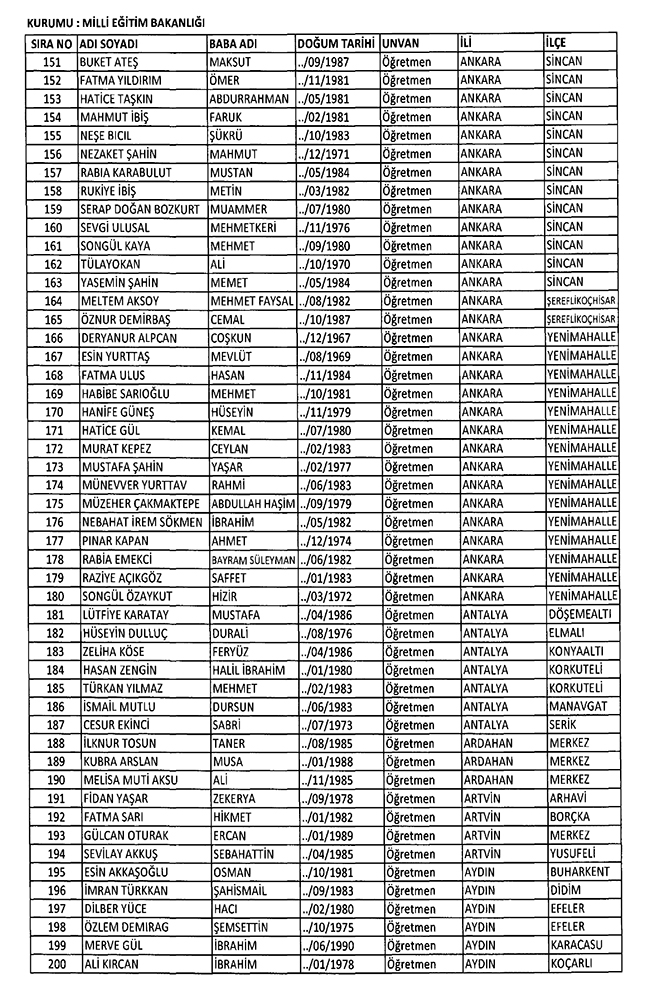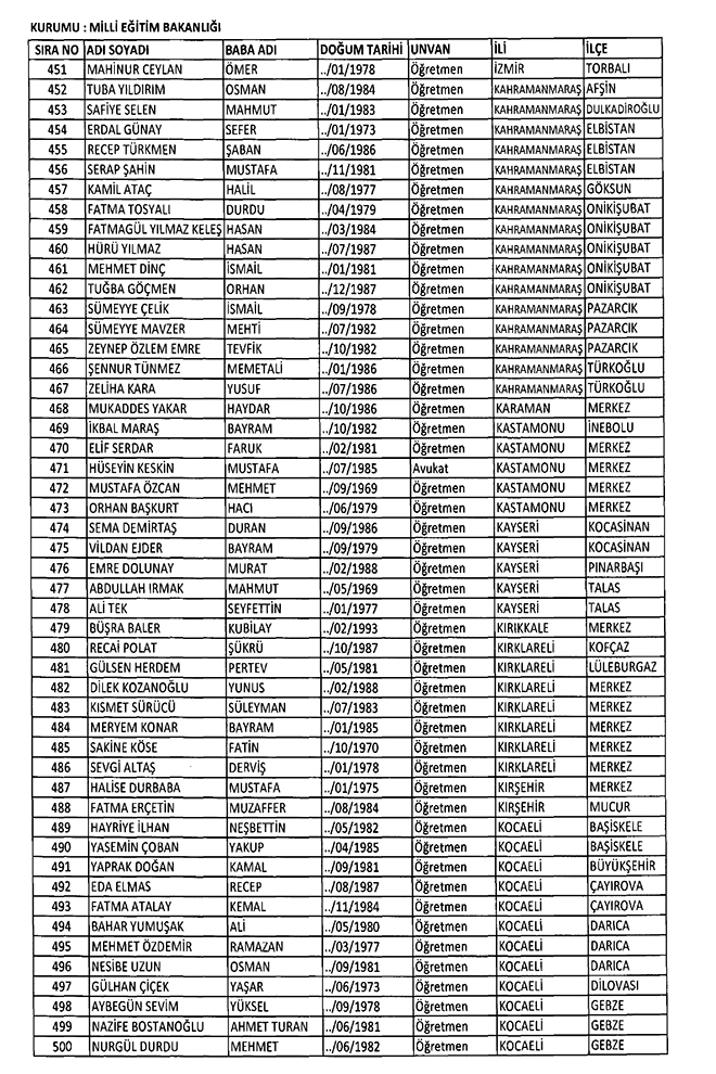 8 Temmuz 2018 tarihli Resmi Gazetede yayımlanan 701 sayılı KHK ile ihraç edilen 658 öğretmenin isim listesi