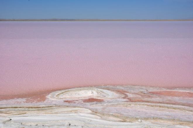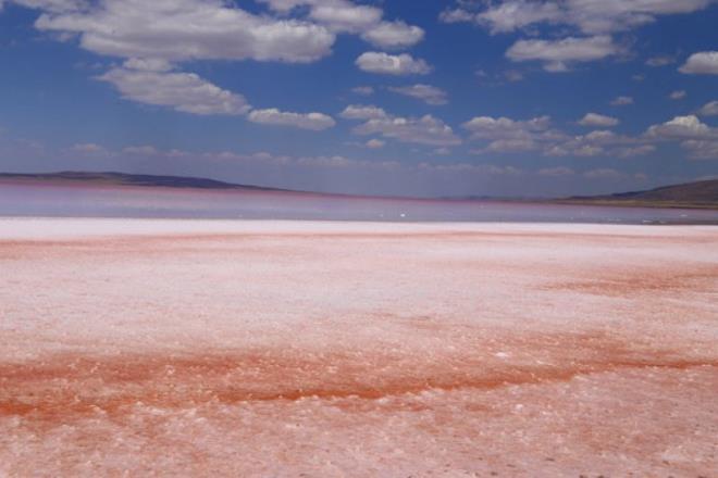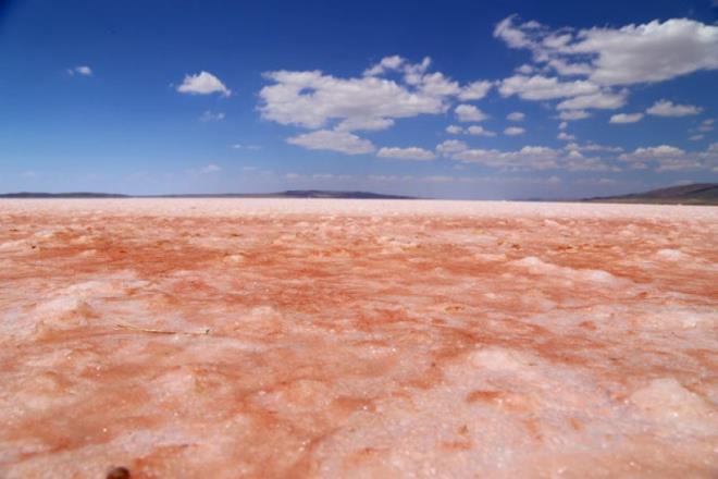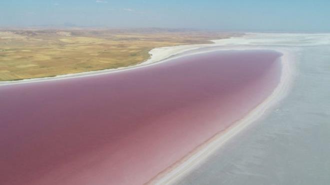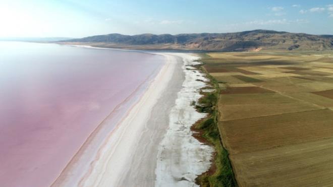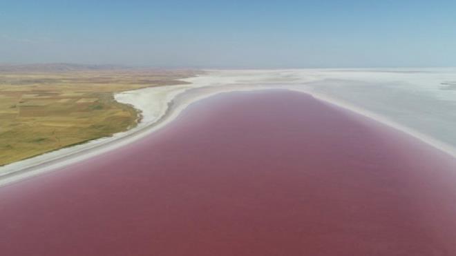 Kışın buz mavisi, yazın beyaz rengiyle dikkati çeken Tuz Gölü'nde, bugünlerde bir alg türü olan "dunaliella salina"lar nedeniyle adeta kırmızı beyaz şölen yaşanıyor.