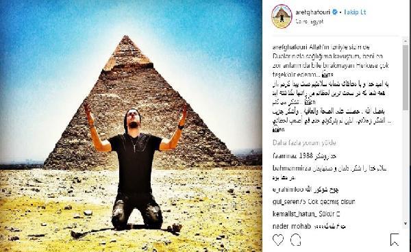 Instagram'daki kişisel sayfasında piramitler önünde dua eder halde bir fotoğrafını paylaşan Ghafouri, "Allah'ın izniyle sizin de dualarınızla sağlığıma kavuştum, beni en zor anlarımda bile bırakmayan herkese çok teşekkür ederim." ifadelerini kullandı.