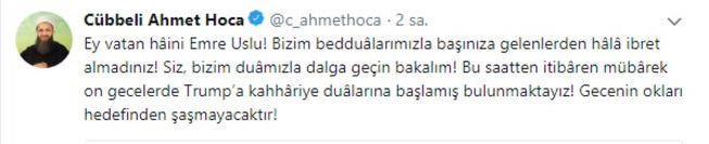 CÜBBELİ'DEN CEVAP GELDİ Cübbeli Ahmet Hoca, 'Ey vatan hâini Emre Uslu! Bizim bedduâlarımızla başınıza gelenlerden hâlâ ibret almadınız! Siz, bizim duâmızla dalga geçin bakalım! Bu saatten itibâren mübârek on gecelerde Trump’a kahhâriye duâlarına başlamış bulunmaktayız! Gecenin okları hedefinden şaşmayacaktır!' sözleriyle Emre Uslu'ya cevap verdi.