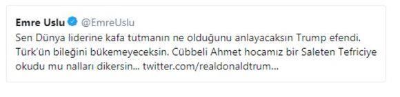 Sen Dünya liderine kafa tutmanın ne olduğunu anlayacaksın Trump efendi. Türk’ün bileğini bükemeyeceksin. Cübbeli Ahmet hocamız bir Saleten Tefriciye okudu mu nalları dikersin.