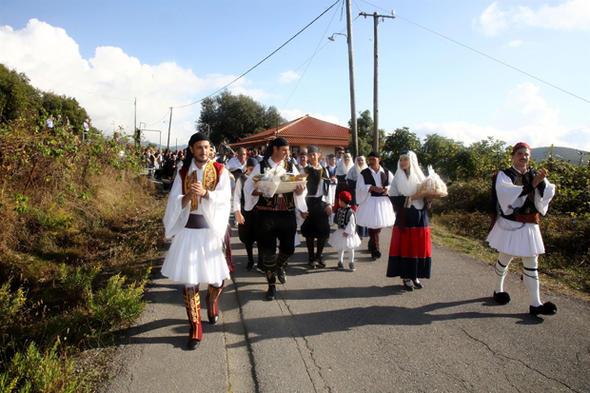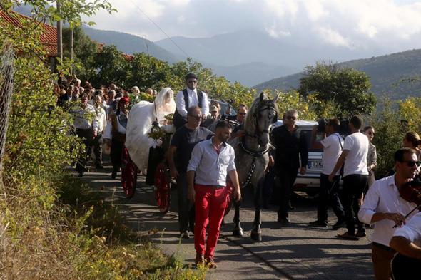 Menounos, köyün kilisesinde kıyılan nikaha at arabasıyla gitti. Köyün daracık sokaklarındaki geçişi sırasında da kendisine davetliler ve geleneksel müzikler çalan bir grup eşlik etti.