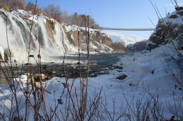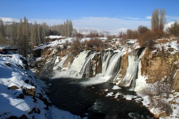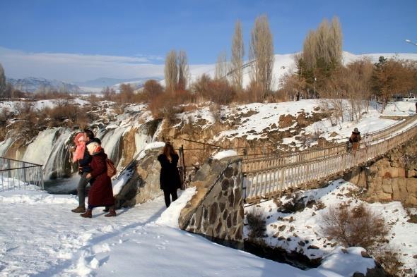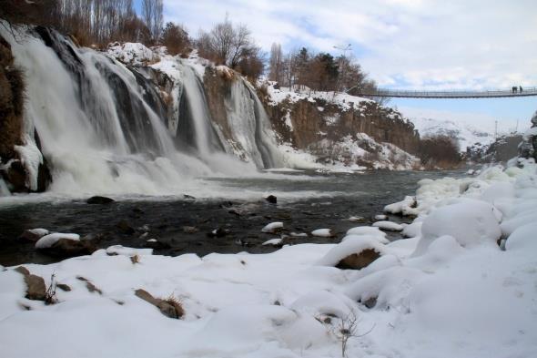 ziyaretçilerini kendine hayran bırakan Muradiye Şelalesi kısmen dondu.