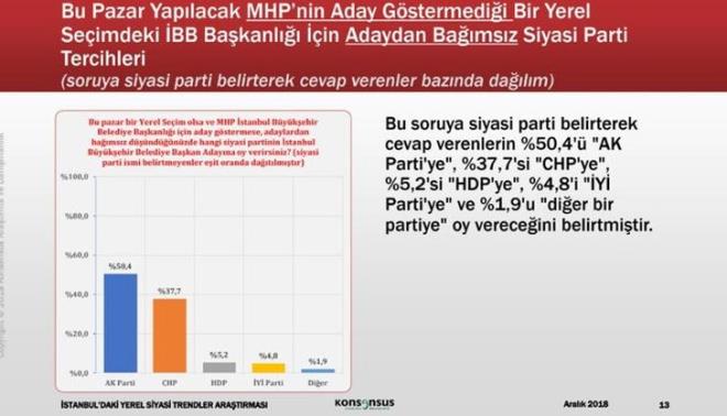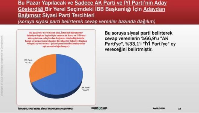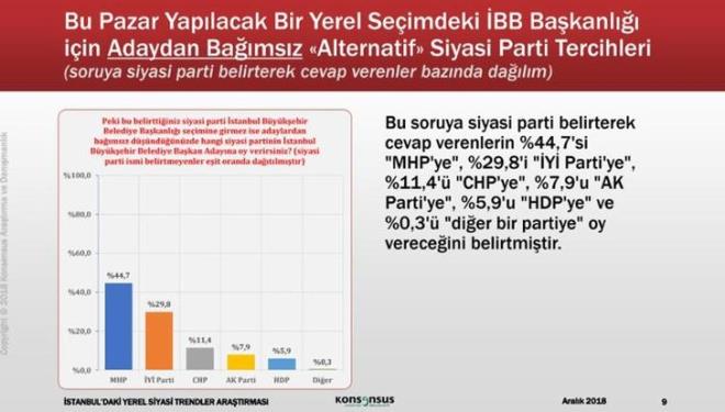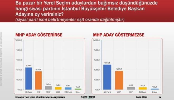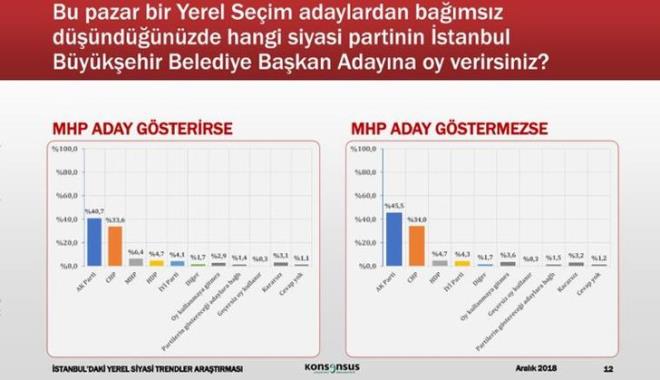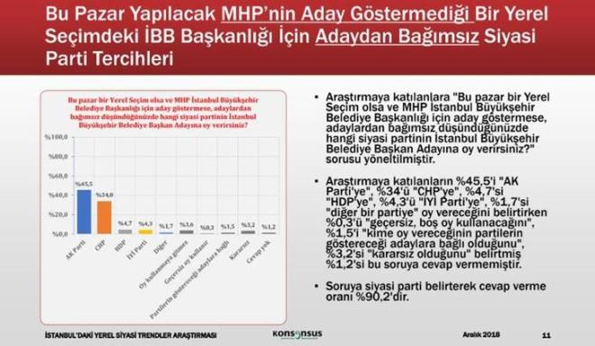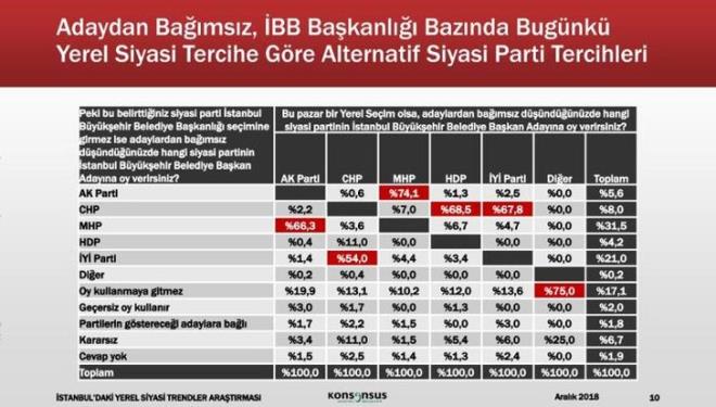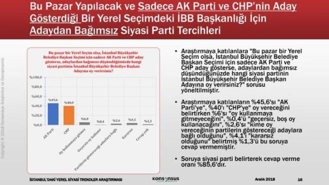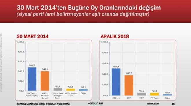 Konsensus Araştırma Şirketi, 31 Mart 2019 yerel seçimine ilişkin İstanbul'da yaptığı son anket sonucunu paylaştı. Anket sonucuna göre, araştırmaya katılanların yüzde 40,7'si AK Parti'ye, yüzde 33,6'sı CHP'ye, yüzde 6,4'ü MHP'ye, yüzde 4,7'si HDP'ye ve yüzde 4,1'i İYİ Parti'ye "adaydan bağımsız" olarak oy vereceklerini belirtti.