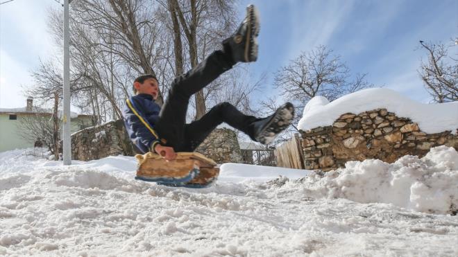 Tahtadan yaptıkları kızakların karda daha hızlı gitmesi için altına plastik su boruları takan çocuklar, gün içinde defalarca mahalledeki tepeye tırmanıp, kayıyor.